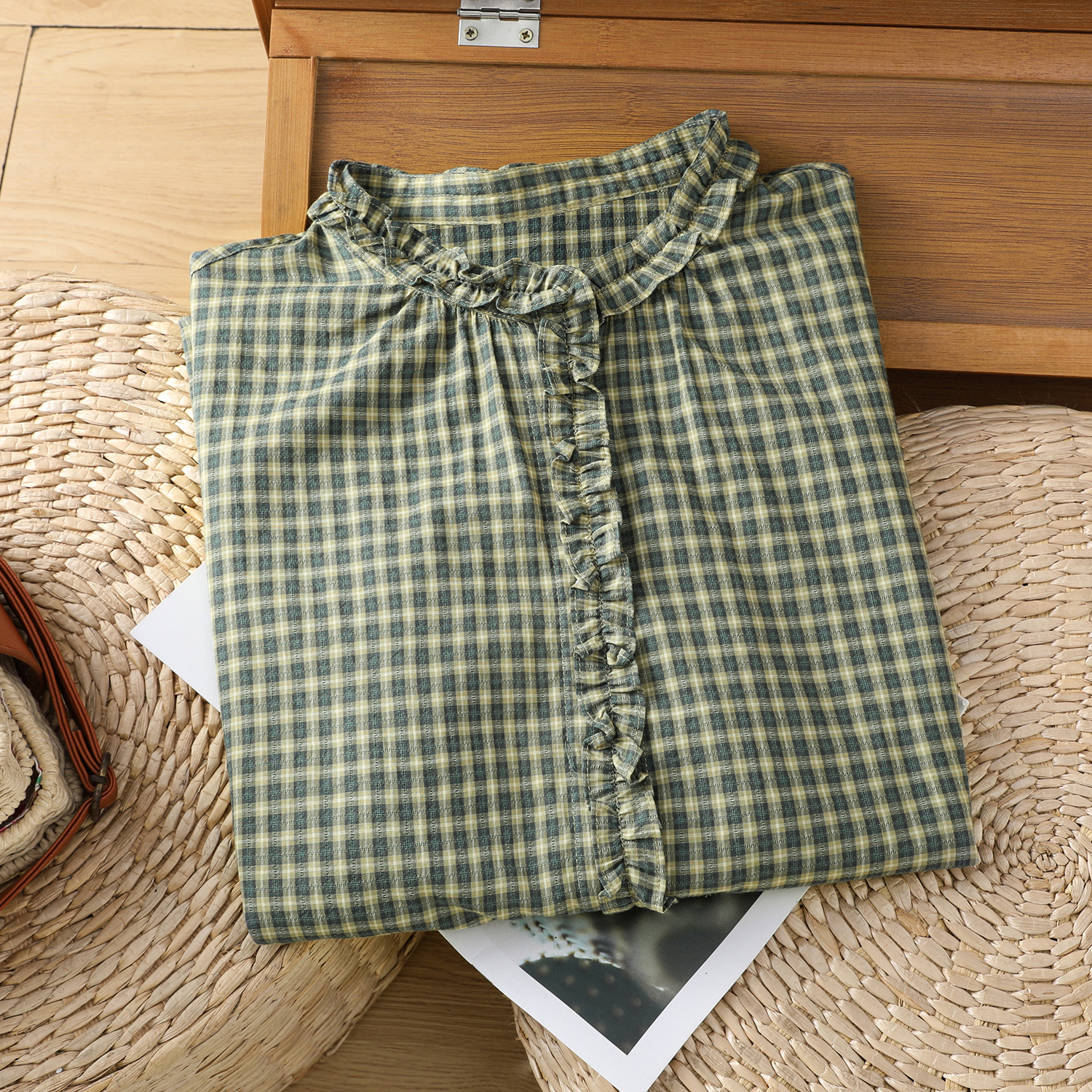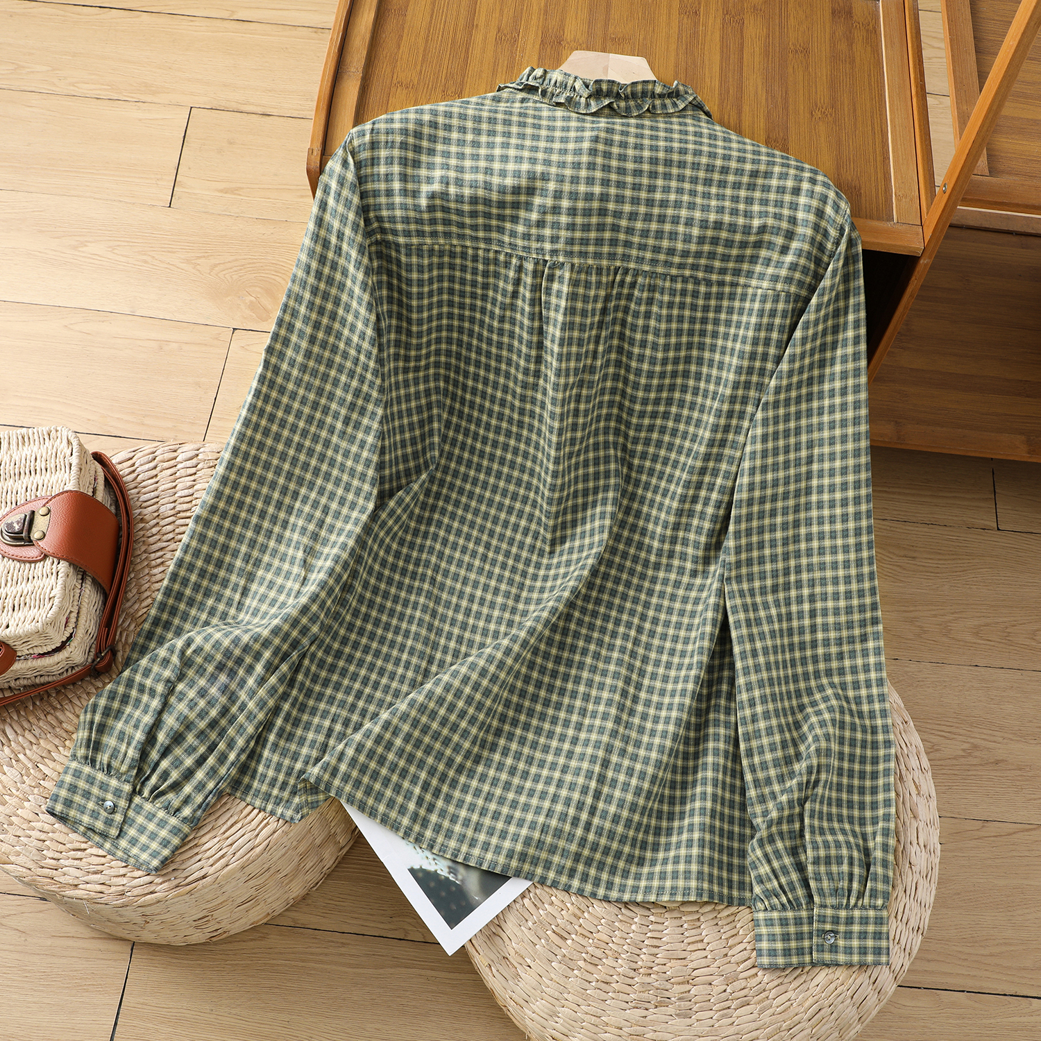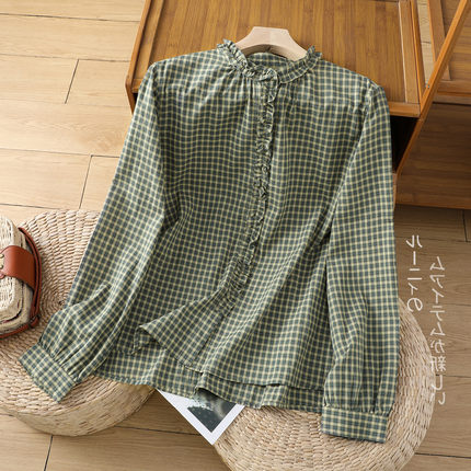 日系绿色格子衬衫女秋季2024新款百搭休闲木耳边纯棉衬衣