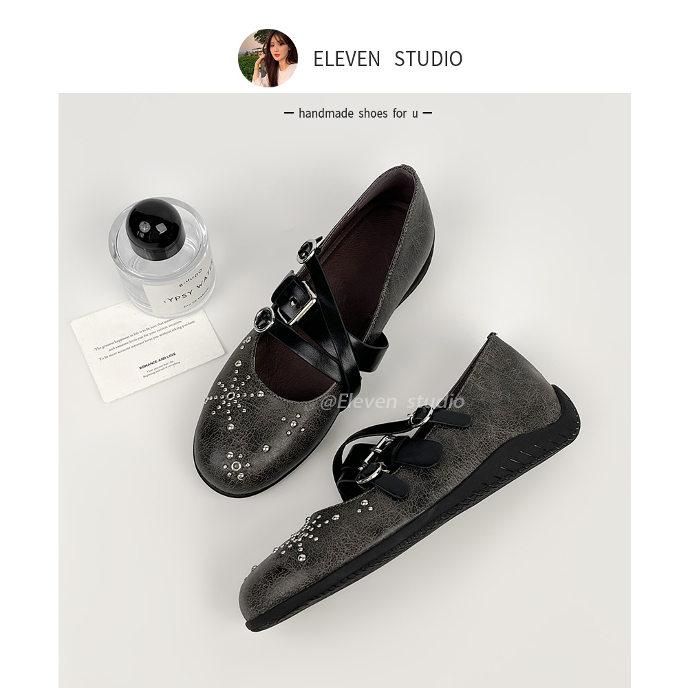 【王11】法式甜酷交叉带铆钉浅口玛丽珍鞋设计感单鞋4CM/花蕊