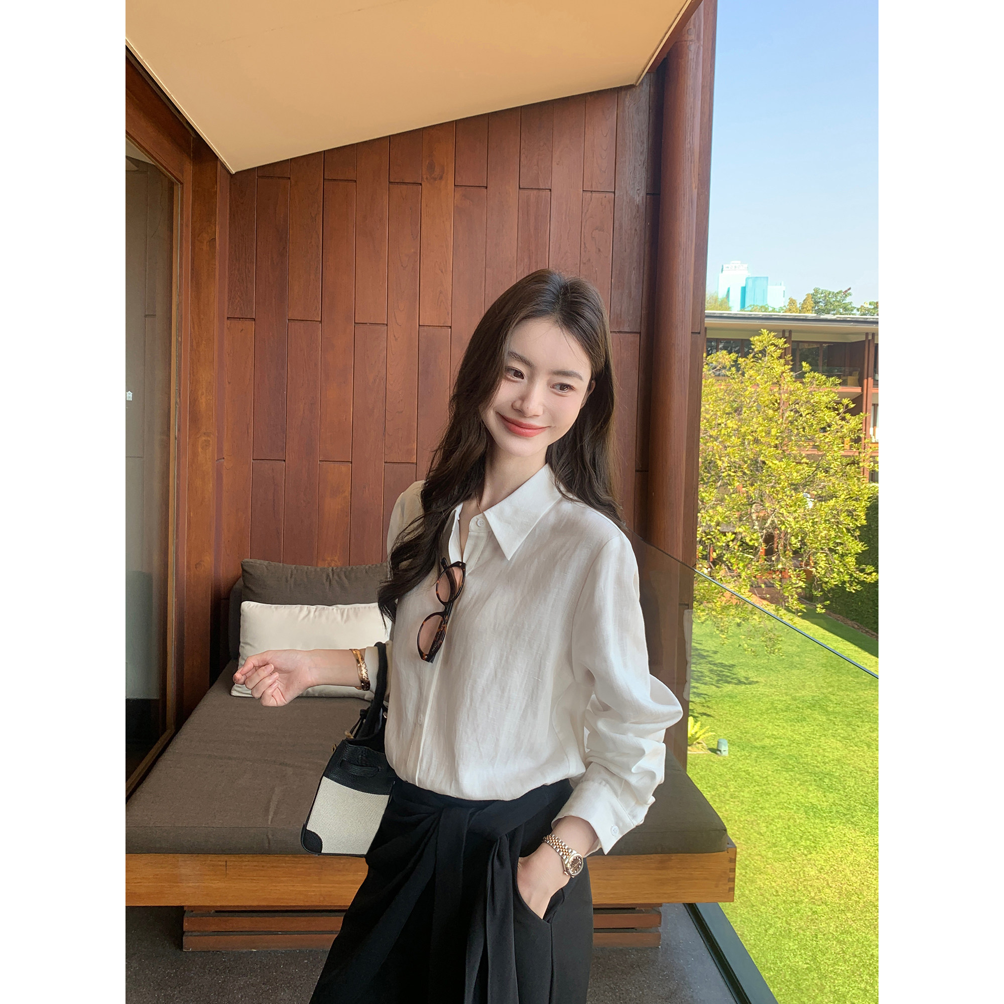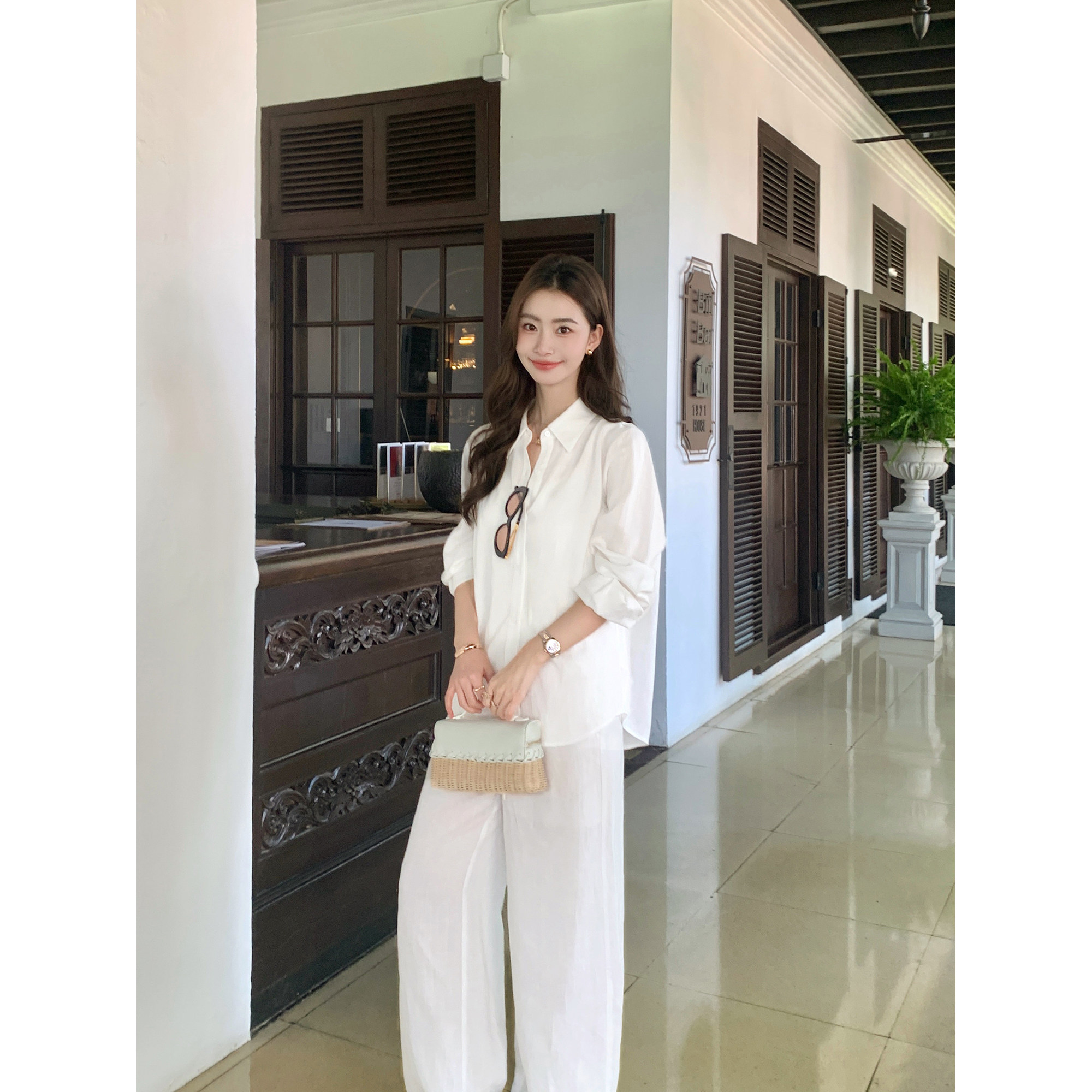 莱赛尔亚麻长袖白衬衫休闲裤套装