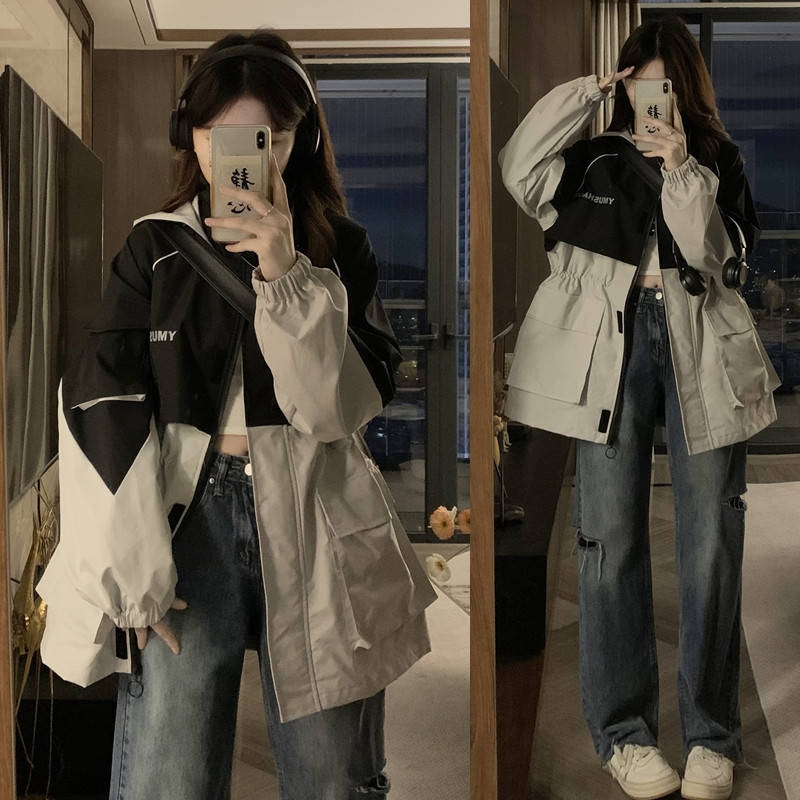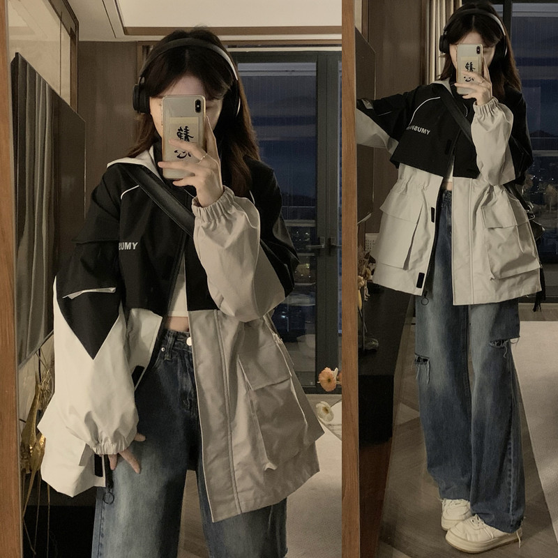 美式拼接冲锋衣外套女春秋2024新款宽松大码收腰休闲连帽工装风衣