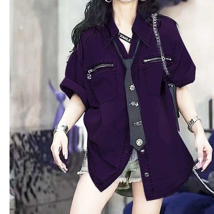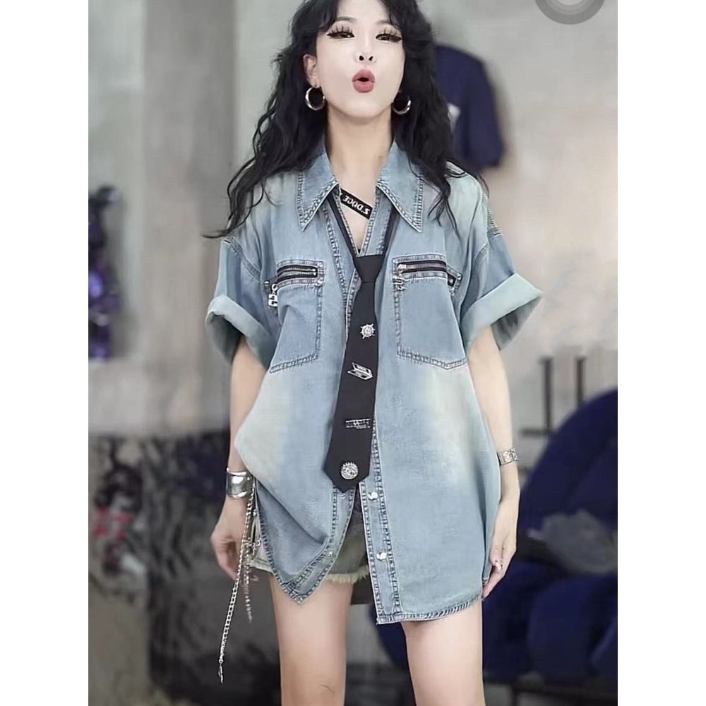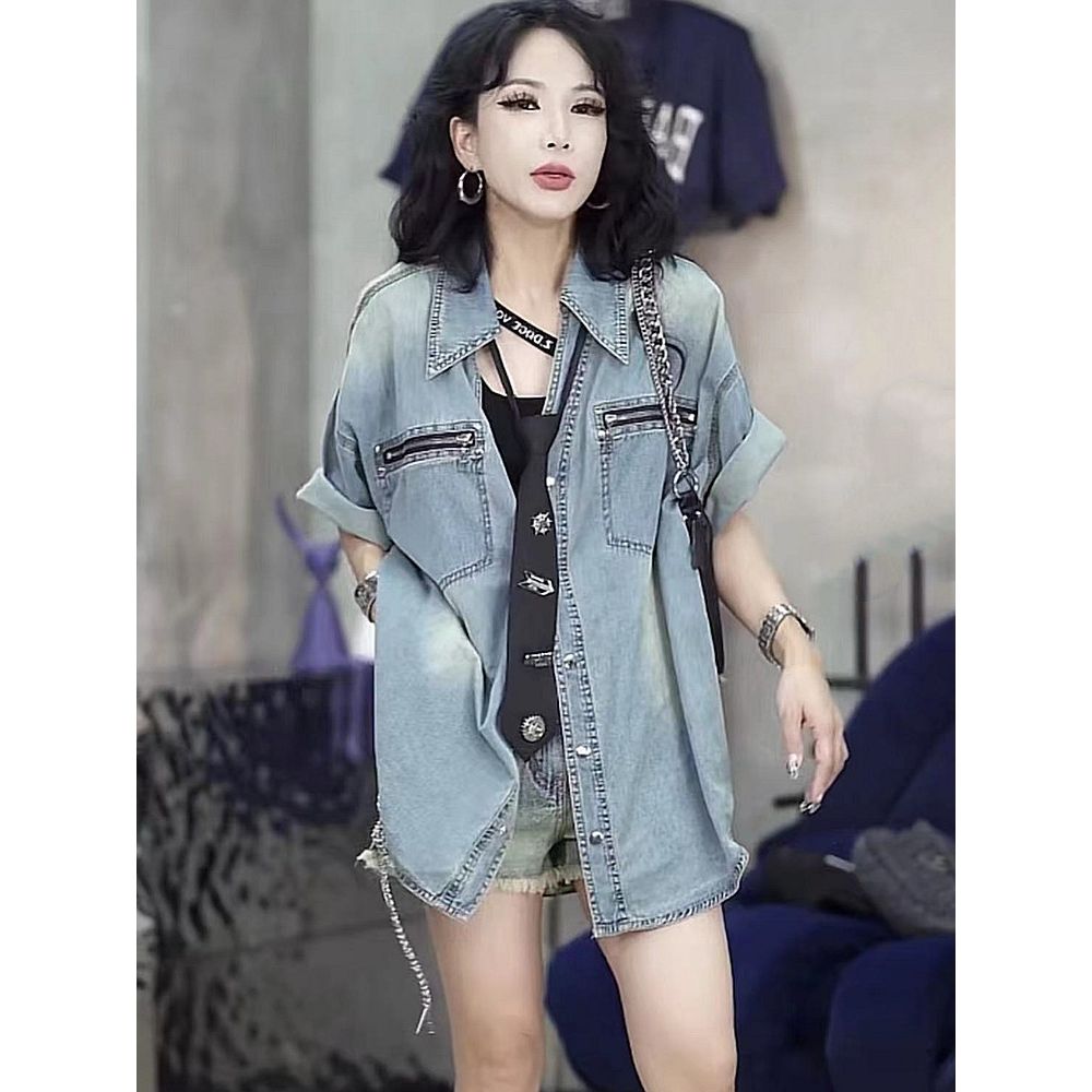 欧洲站时尚休闲双兜水洗牛仔衬衫女夏季新款潮牌宽松百搭短袖外套
