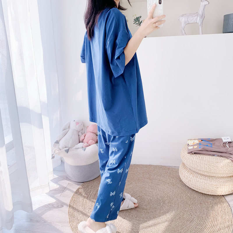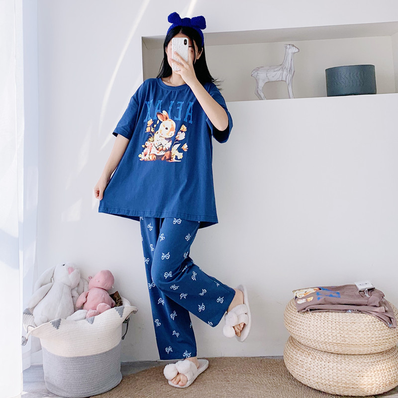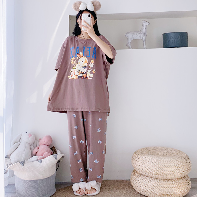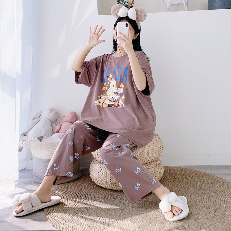 圆领短袖长裤情侣纯棉睡衣春夏大码两件套胖mm男女卡通宽松家居服