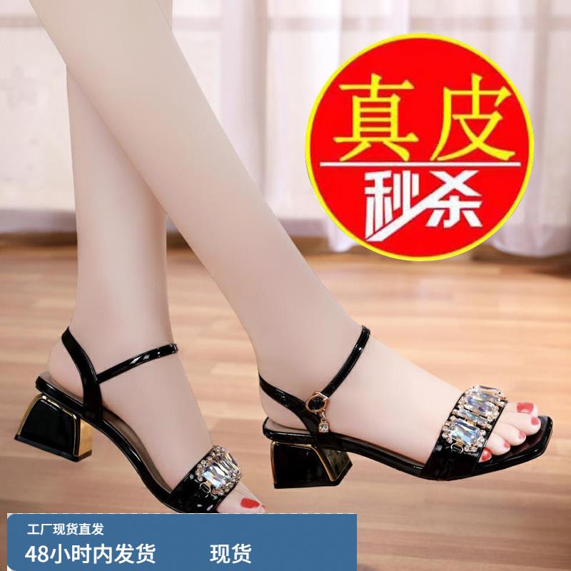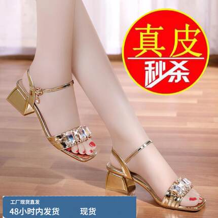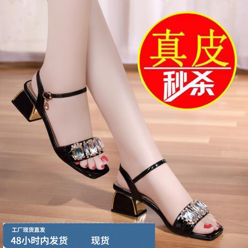真皮一字带水钻中跟方头凉鞋女2024夏季新款仙女风性感粗跟高跟鞋