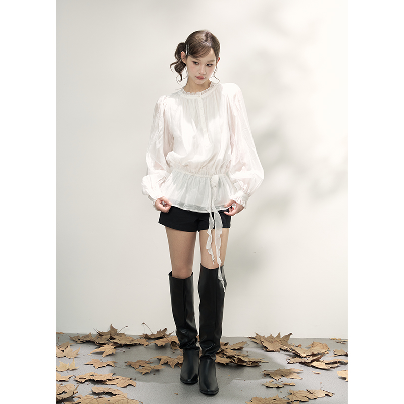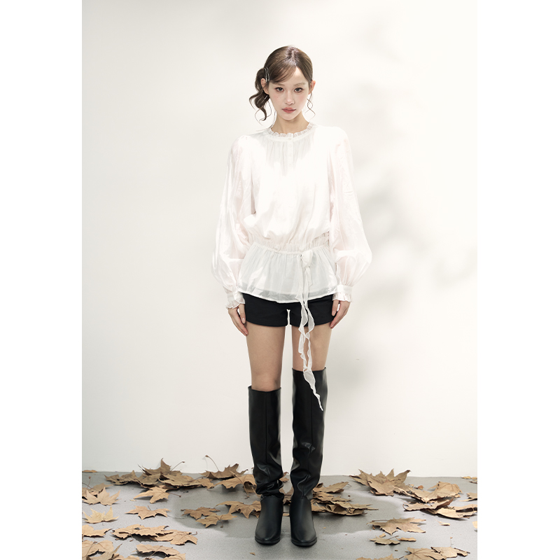 AXIA纯欲风木耳边收腰衬衫女秋季奶系穿搭法式花苞泡泡袖长袖上衣