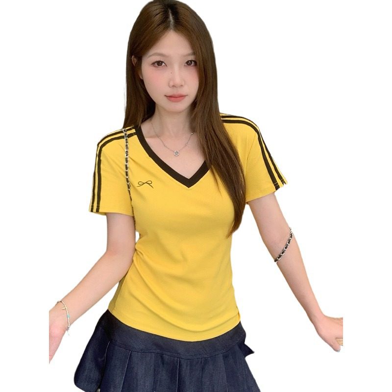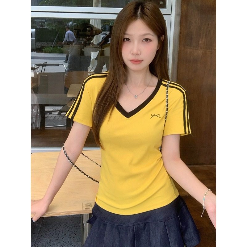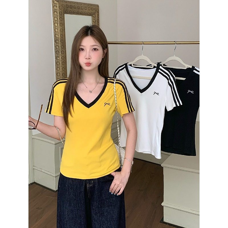 大码胖mm美式运动撞色V领蝴蝶结绣花短袖T恤女夏修身显瘦气质上衣