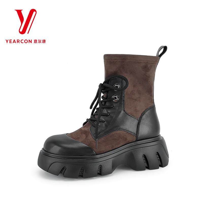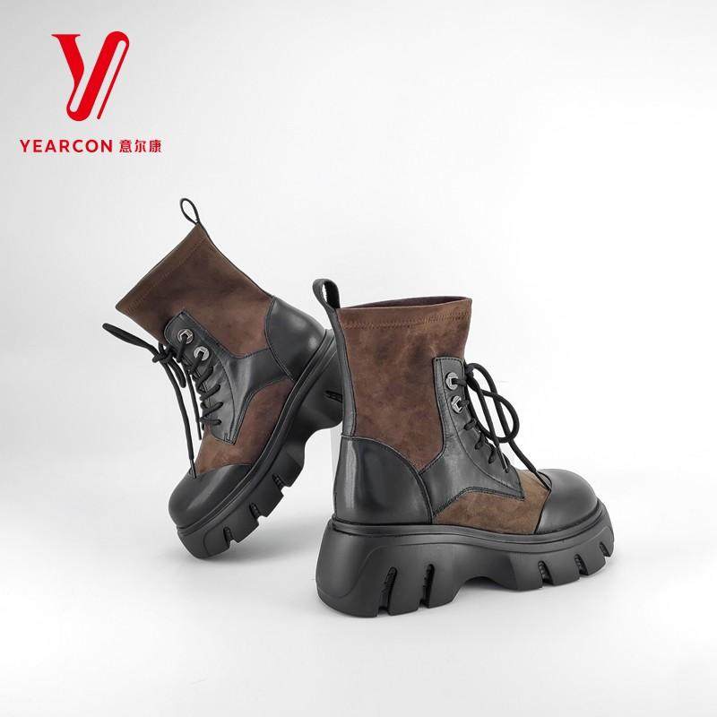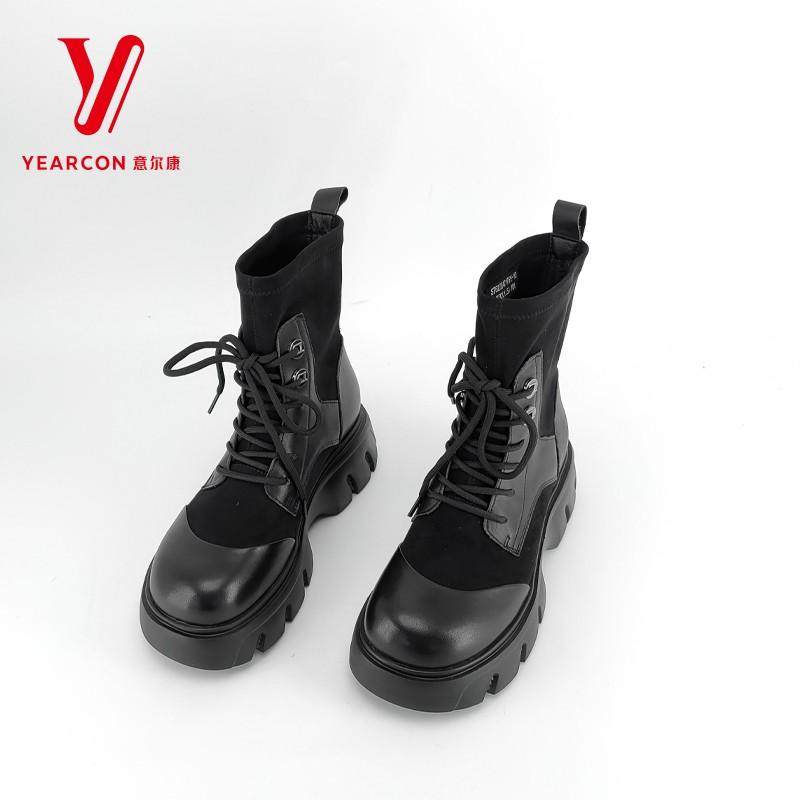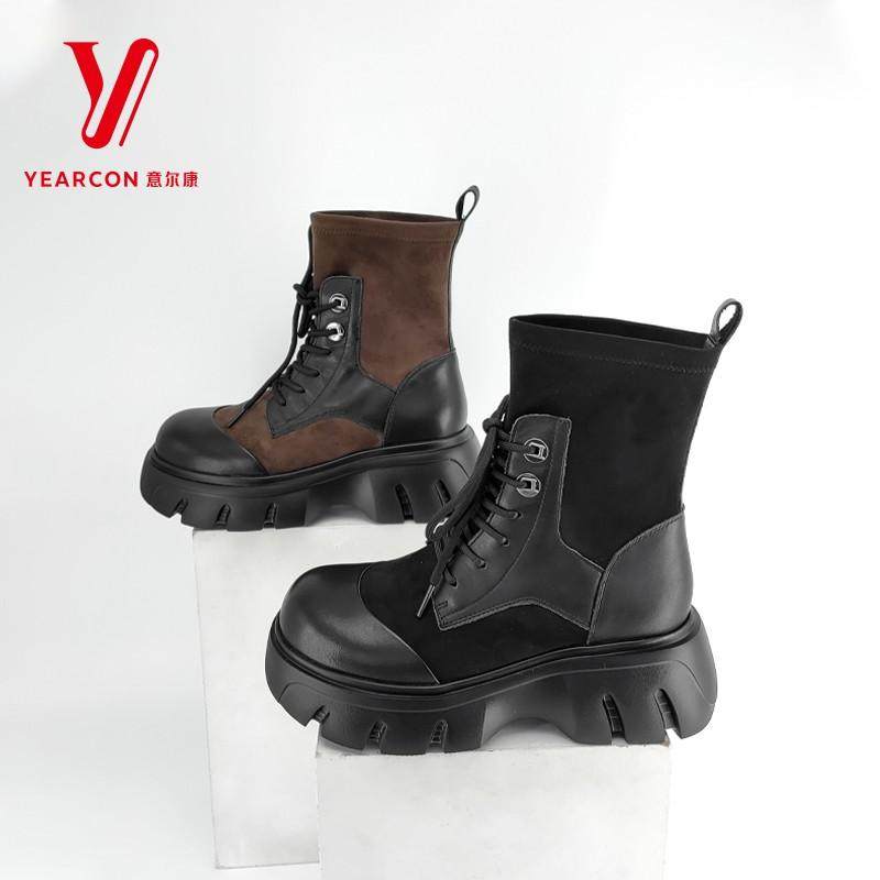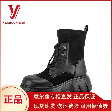 意尔康女靴2025新款英伦风真皮拼色厚底弹力靴工装靴S762ZH47176Y