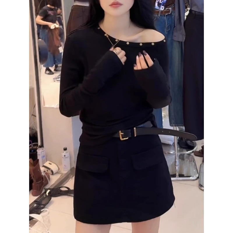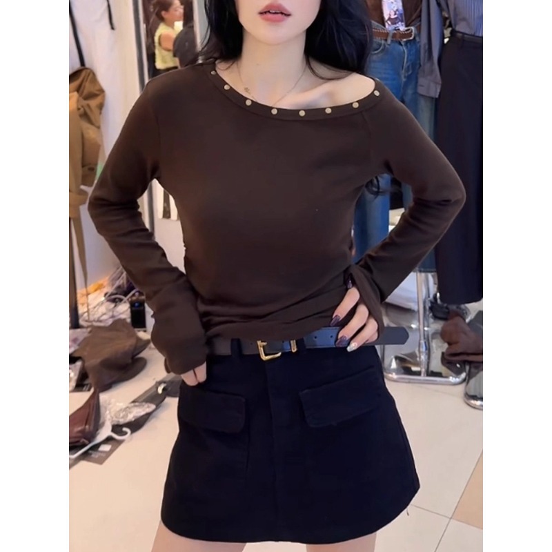 高级感显瘦长袖t恤女秋季2025新款大码胖MM气质斜领露肩打底上衣