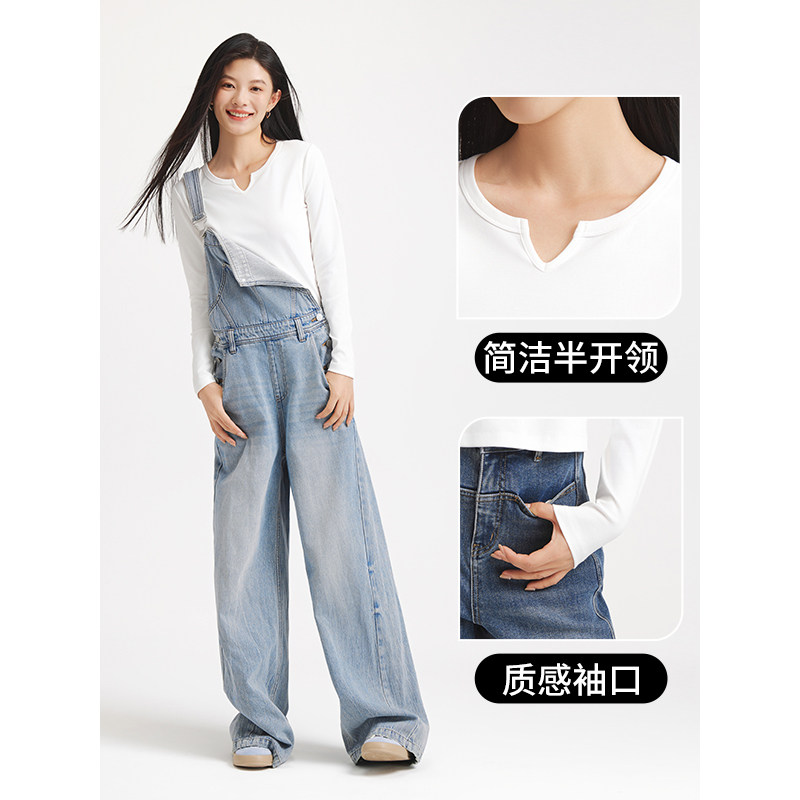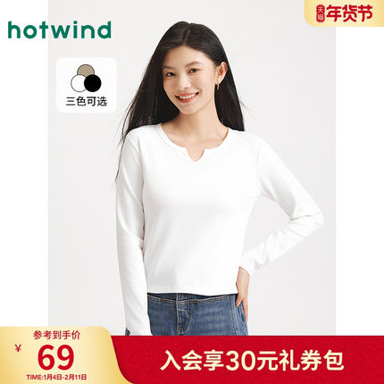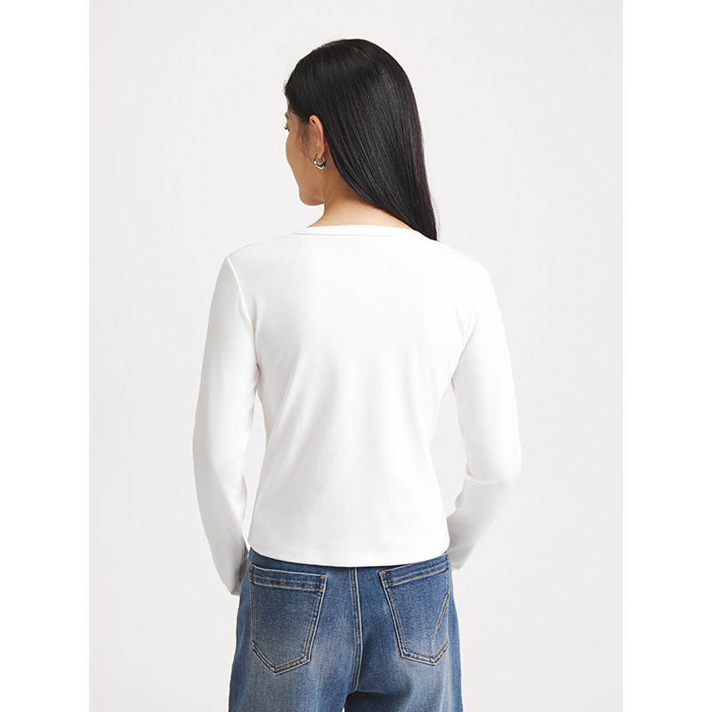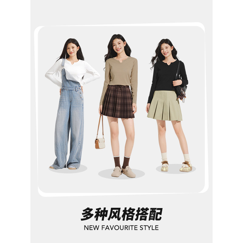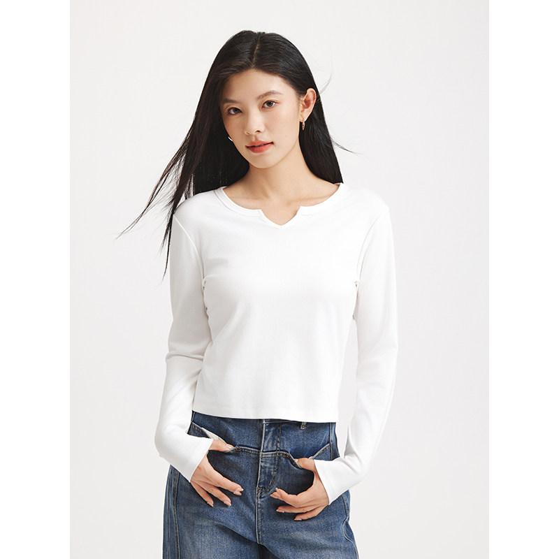 热风女士长袖T恤上衣2025年秋季新款小V领基础款白色内搭打底衫