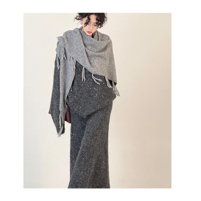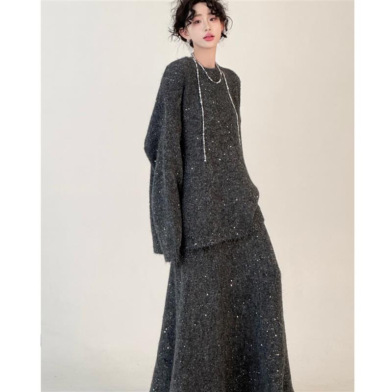 高级感亮片毛衣套装女秋冬新款宽松圆领针织衫松紧腰半身裙两件套