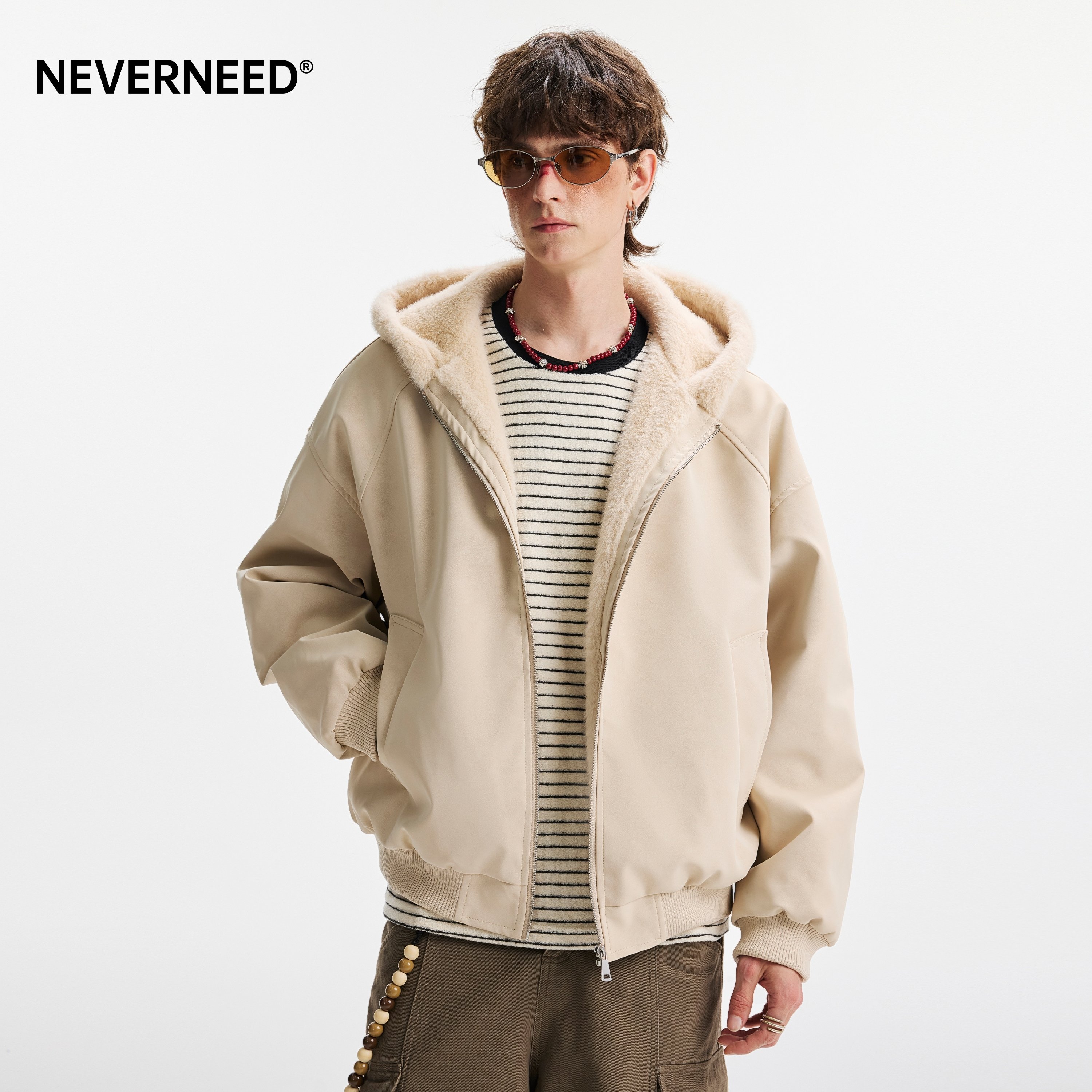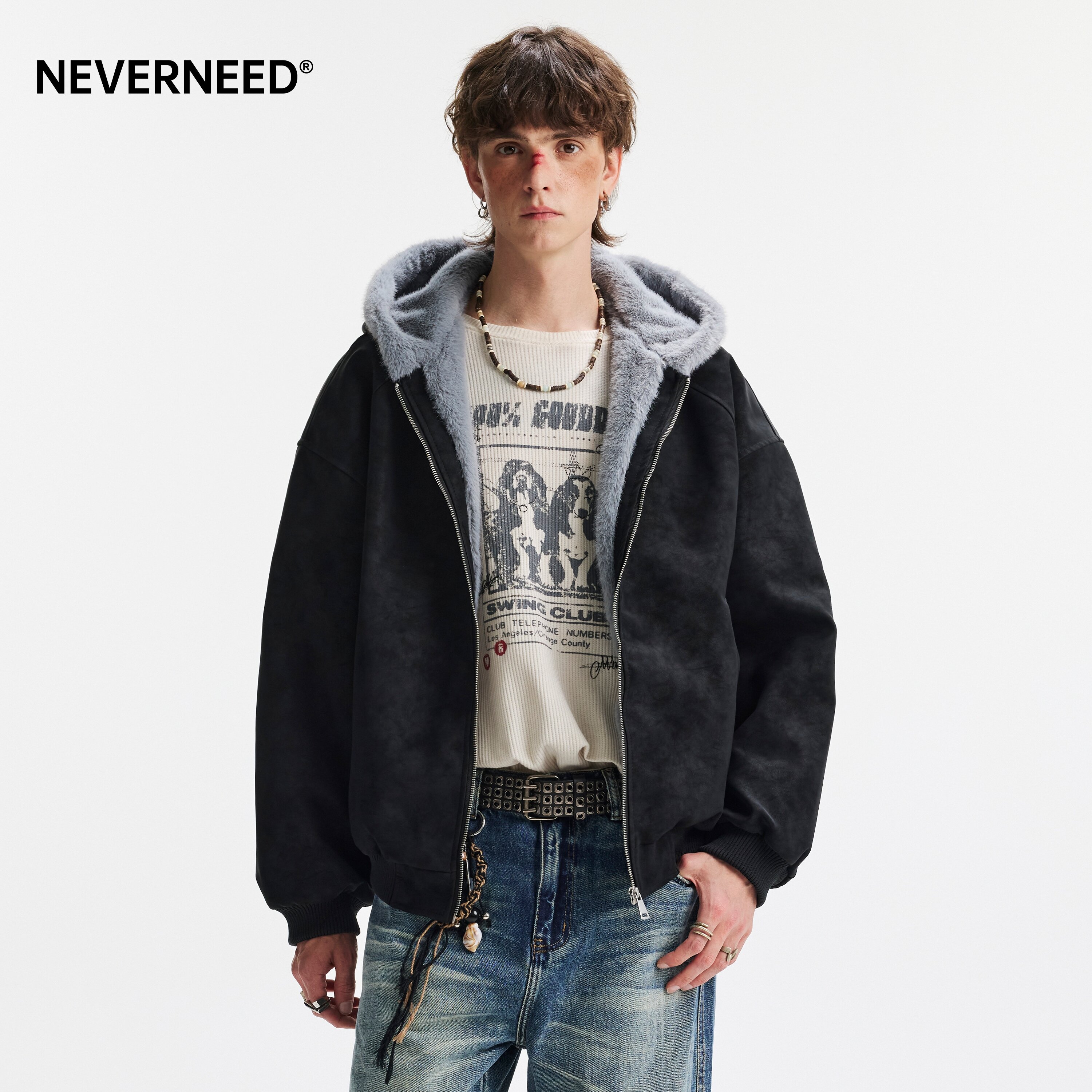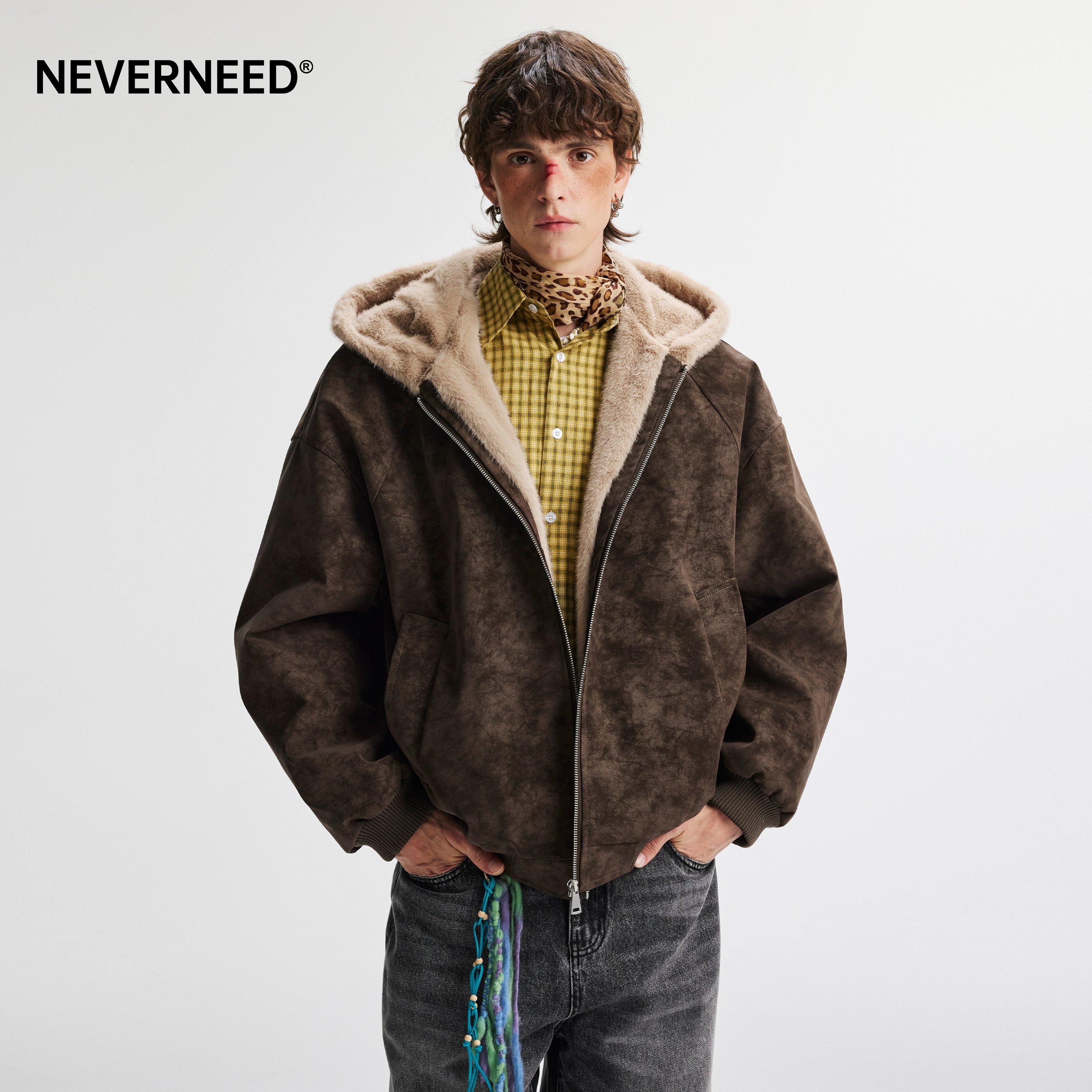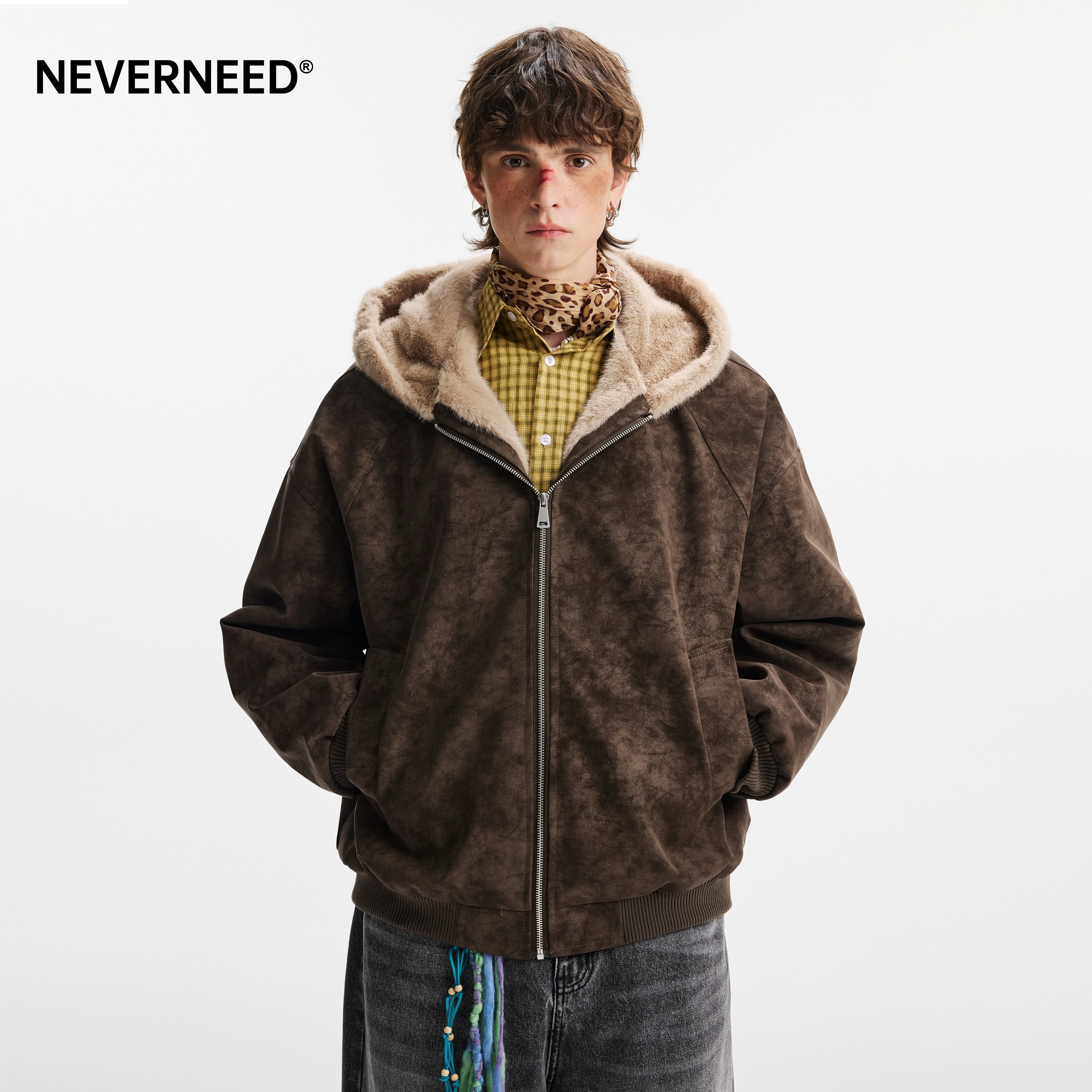 NEVERNEED座山雕PU皮连帽棉衣男女冬季美式复古保暖情侣毛领棉服