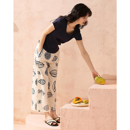 2025新款女士睡衣春夏季纯棉短袖长裤带胸垫家居服时尚阔腿裤套装