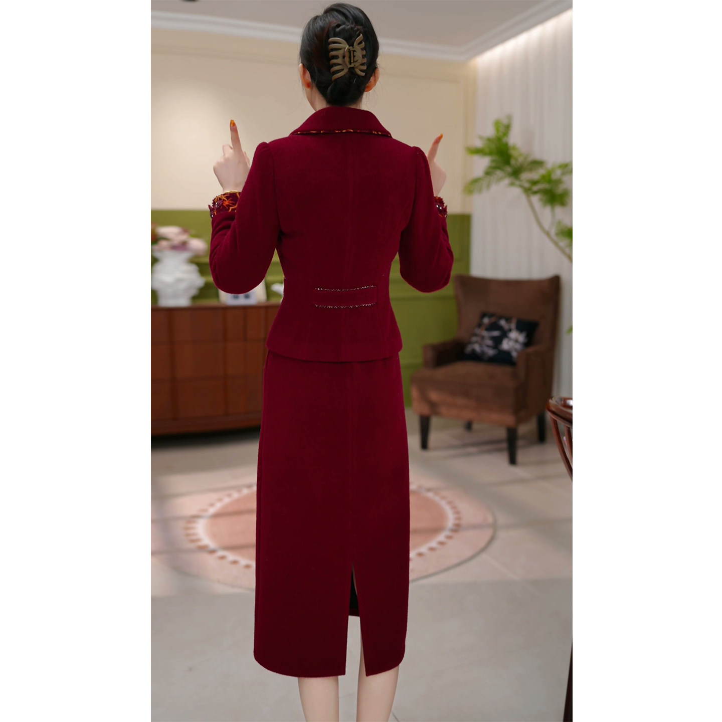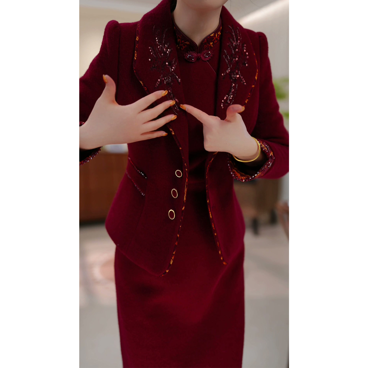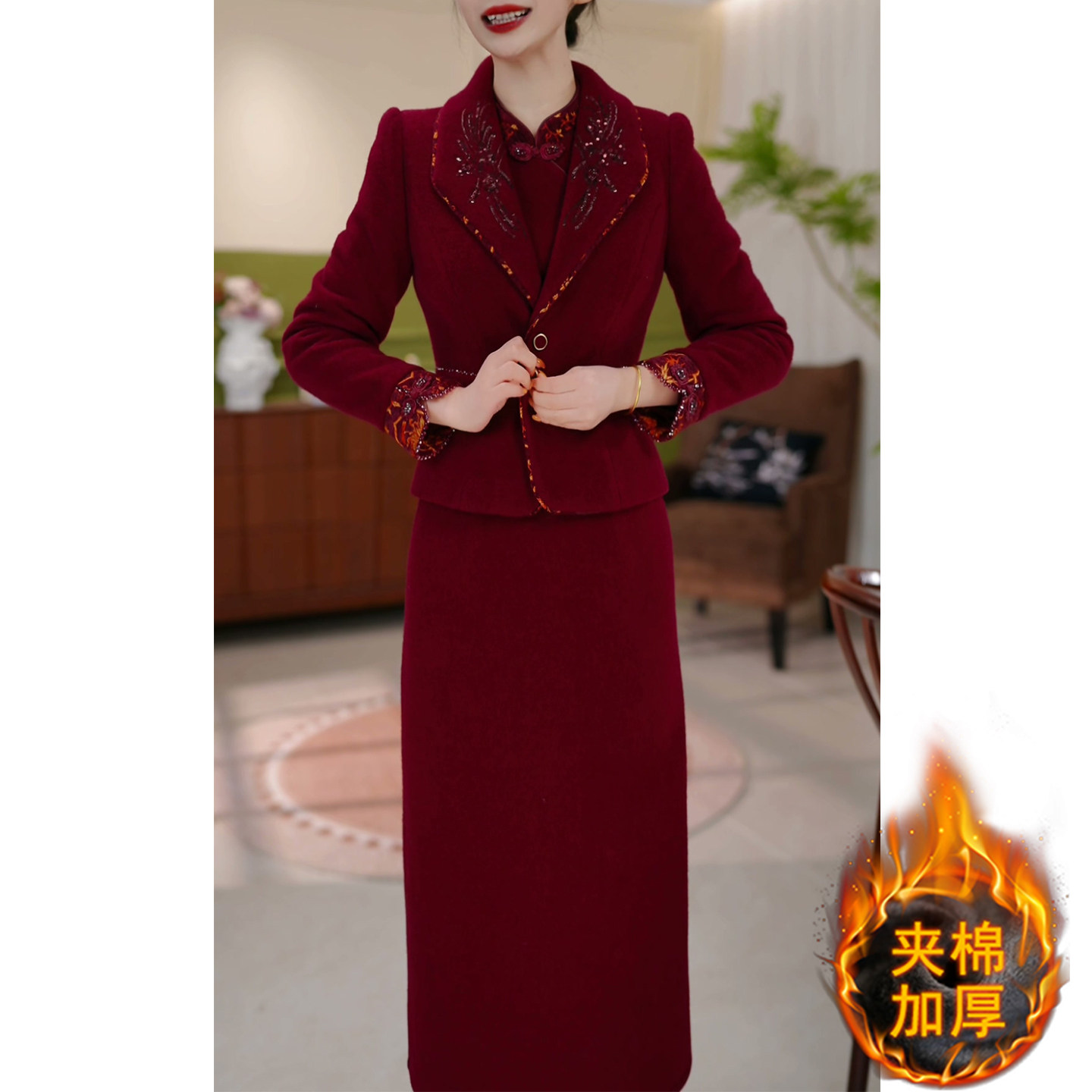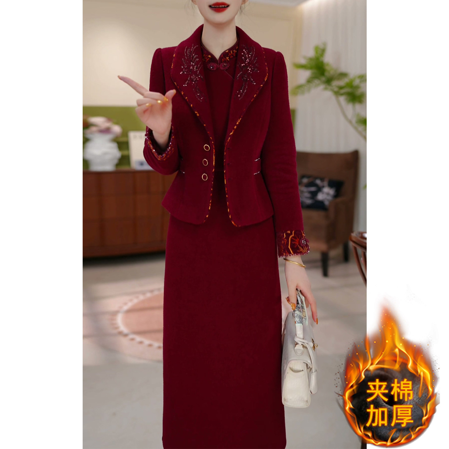 夹棉加厚两件套连衣裙女2025秋冬新款高端精致妈妈婚宴礼服套装裙
