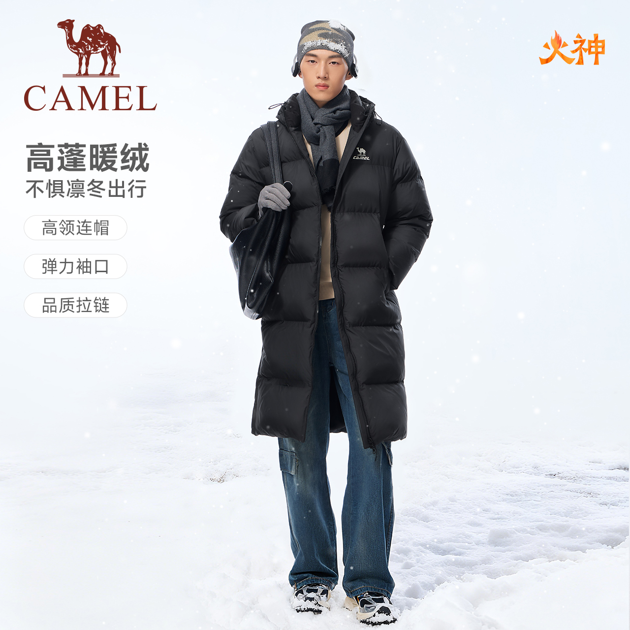 骆驼火神羽绒服中长款男女款冬季北影拒水90鸭绒加厚运动连帽外套