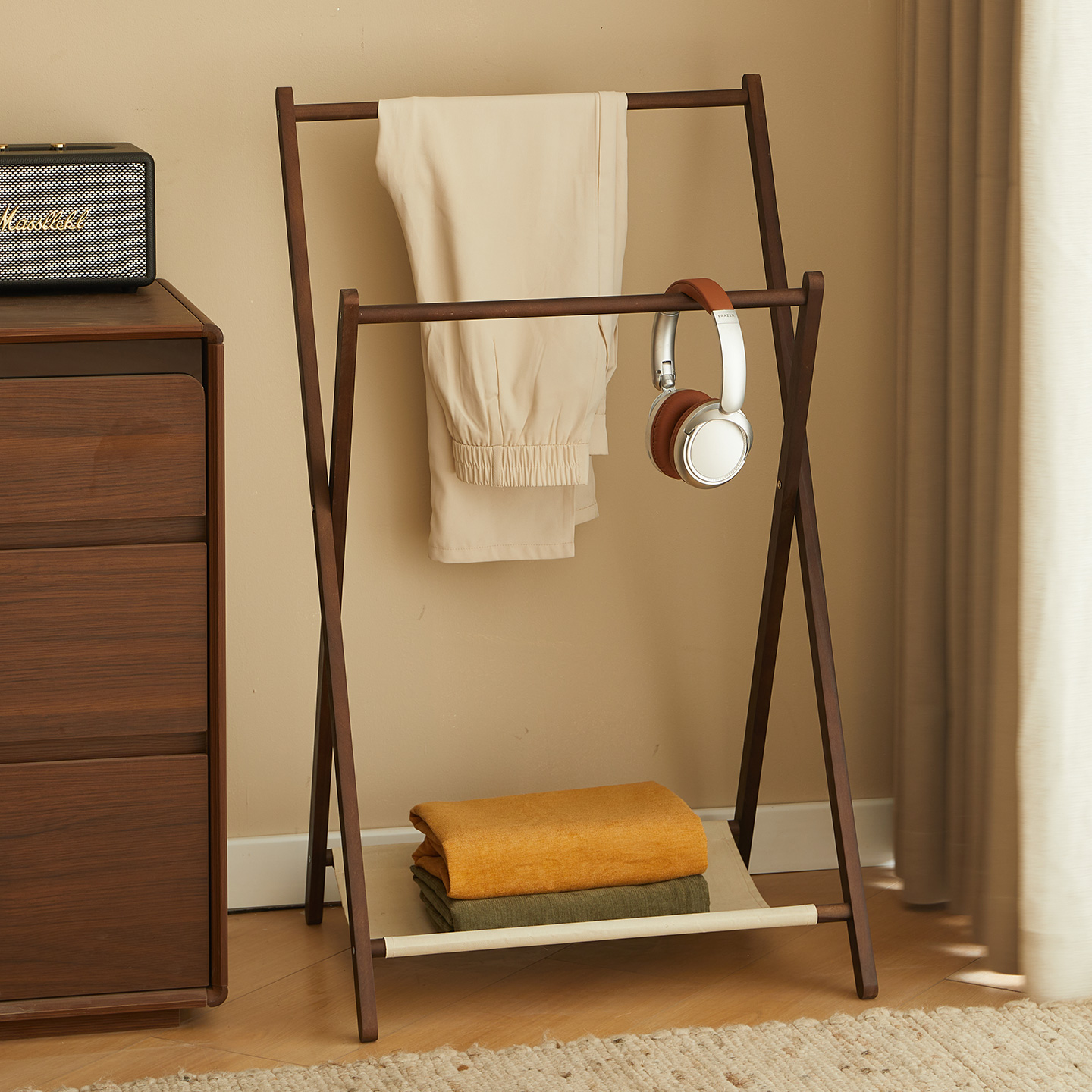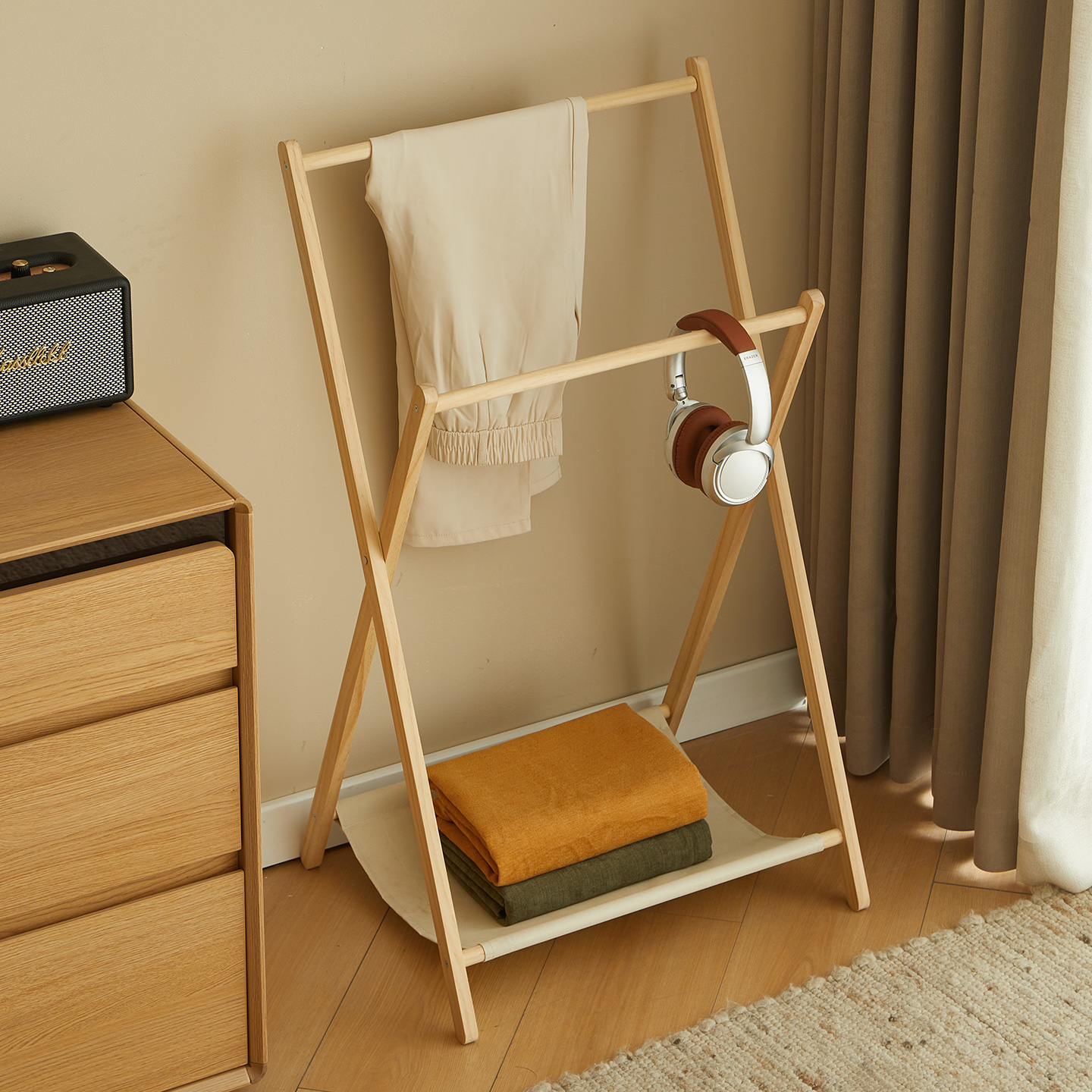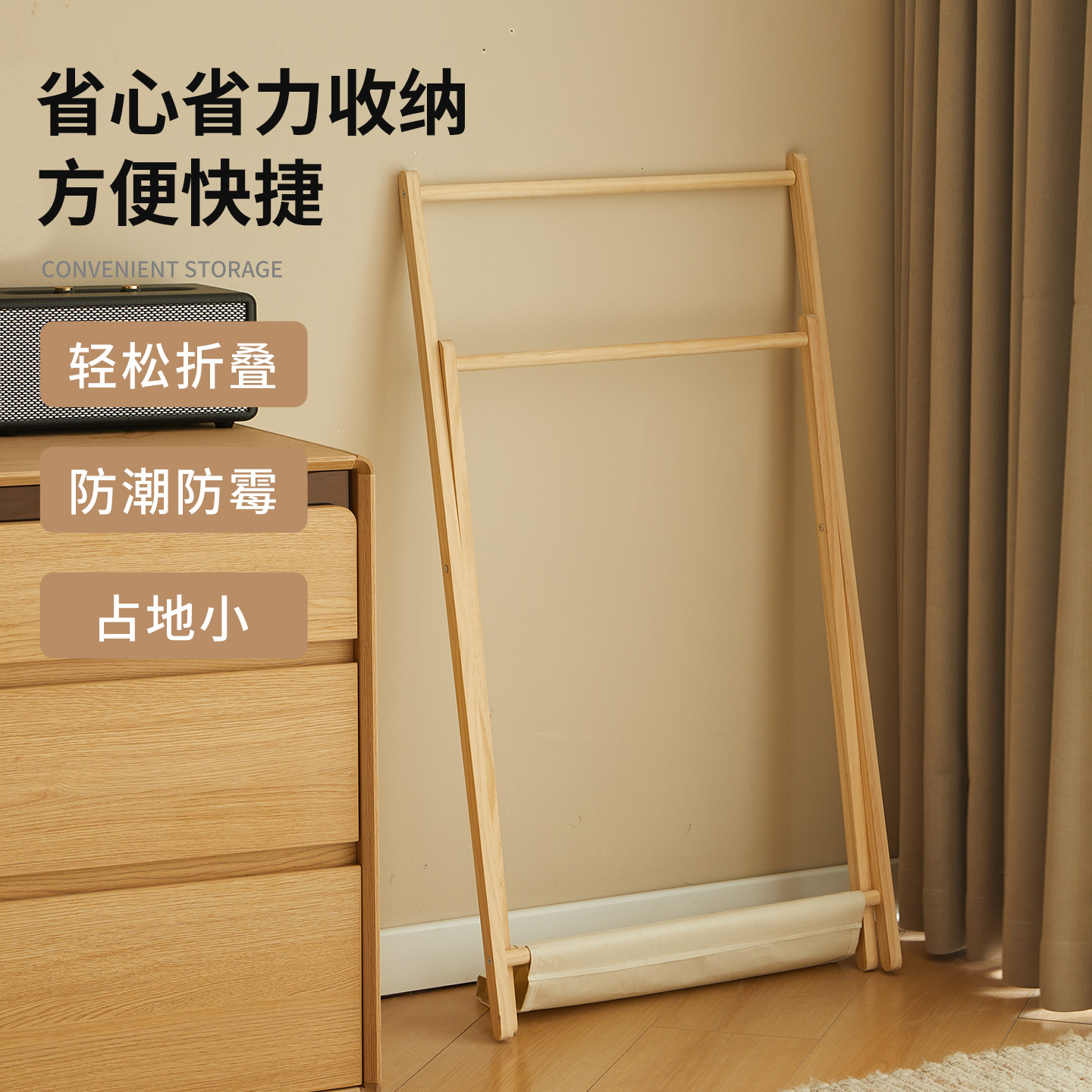 床头实木衣帽架落地卧室临时搭衣裤收纳北欧可折叠家用简易挂衣架