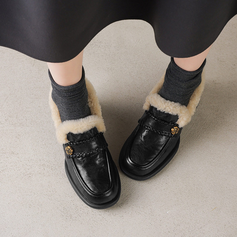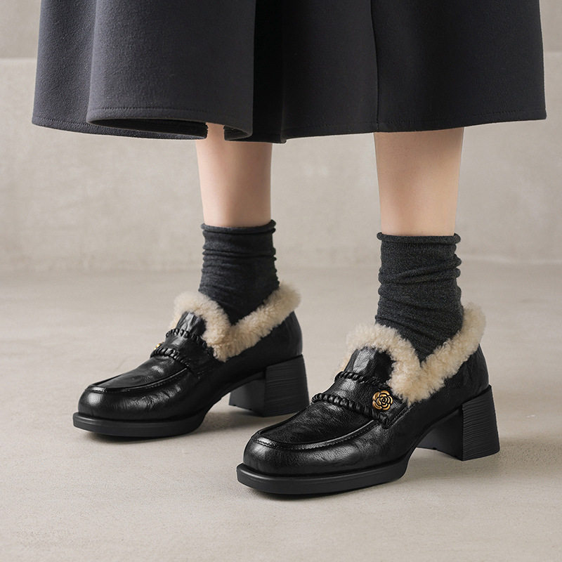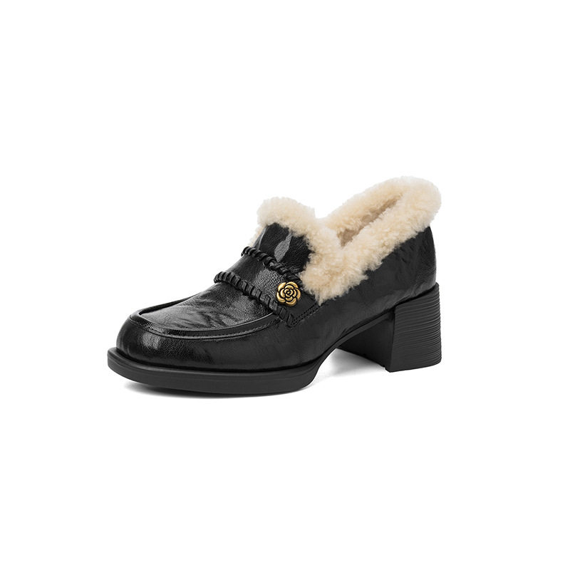 女士山茶花加绒厚时尚2025年秋冬圆头粗跟中跟毛毛鞋气质深口单鞋