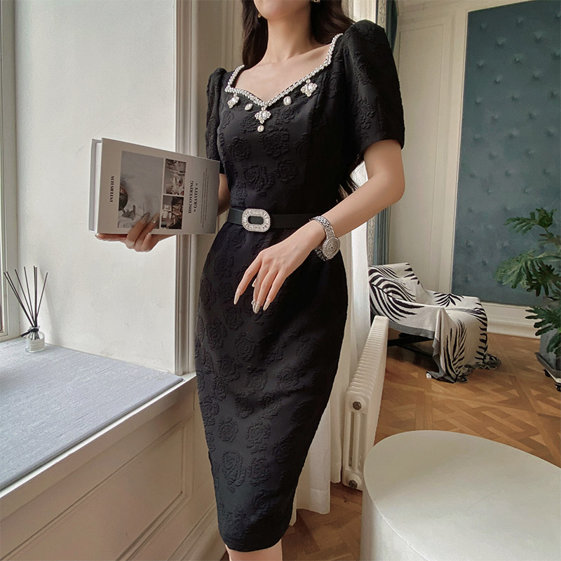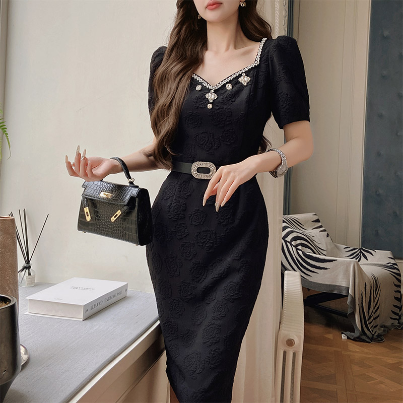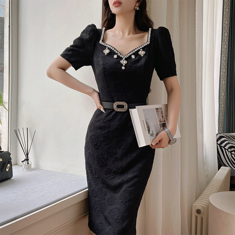 粉红大布娃娃法式显瘦桃心领钉钻短袖连衣裙端庄大气新款女夏