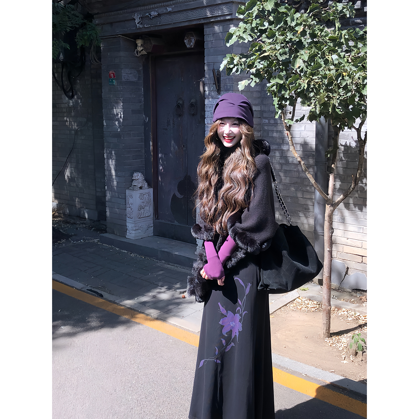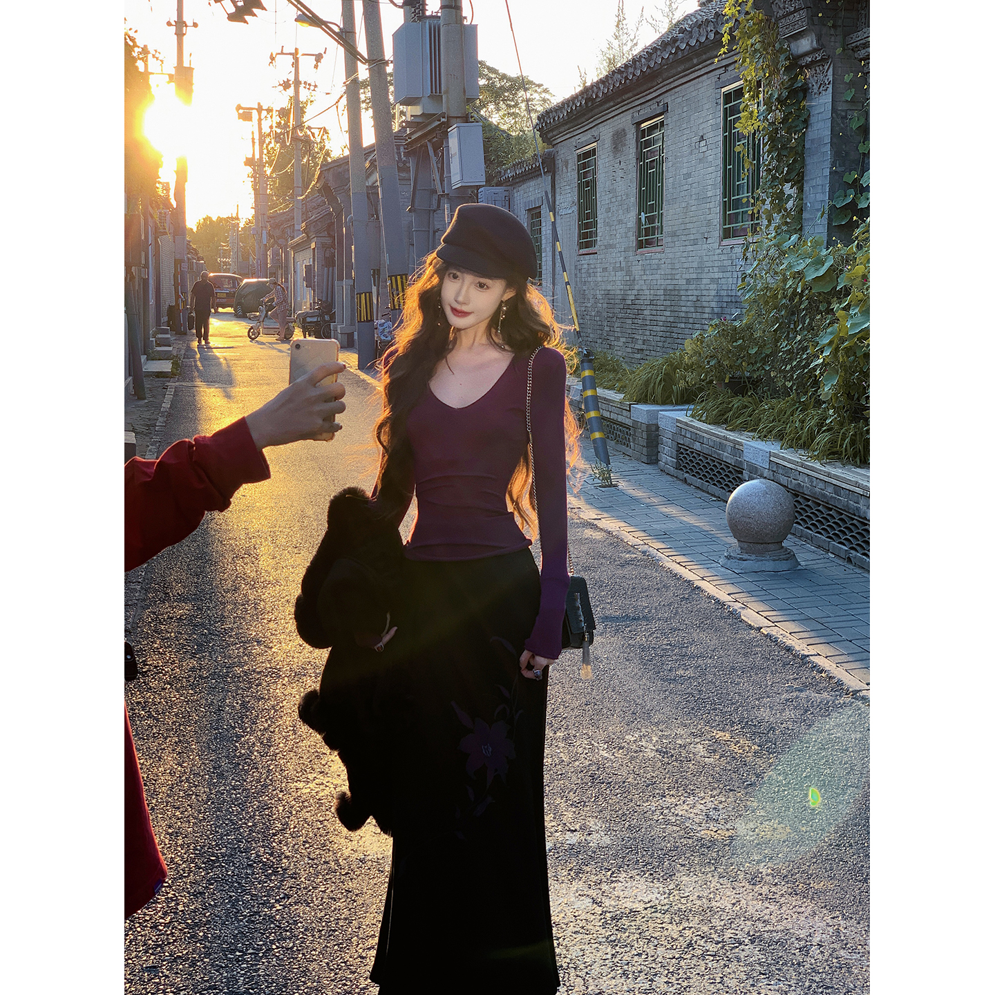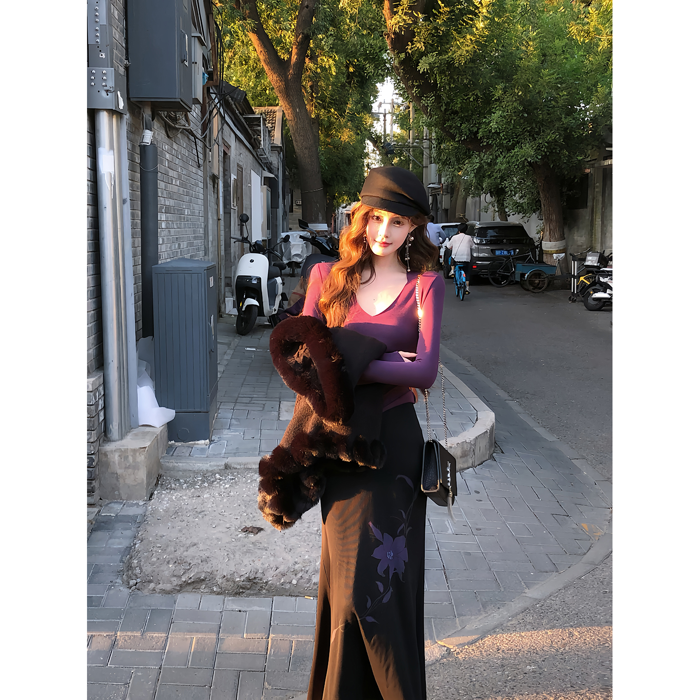 吃绿色菜【凝韵|领20元券】v领弹力针织衫紫色印花鱼尾半裙套装