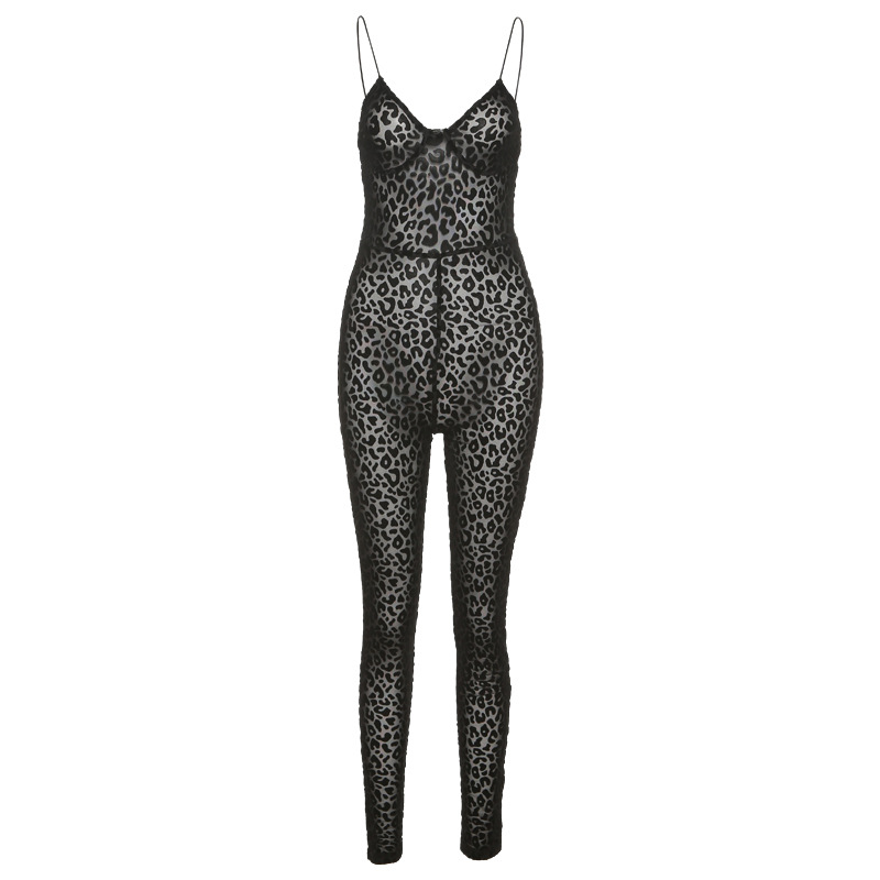 欧美性感辣妹吊带深V网纱透视感修身连体裤女夏季豹纹印花连体衣
