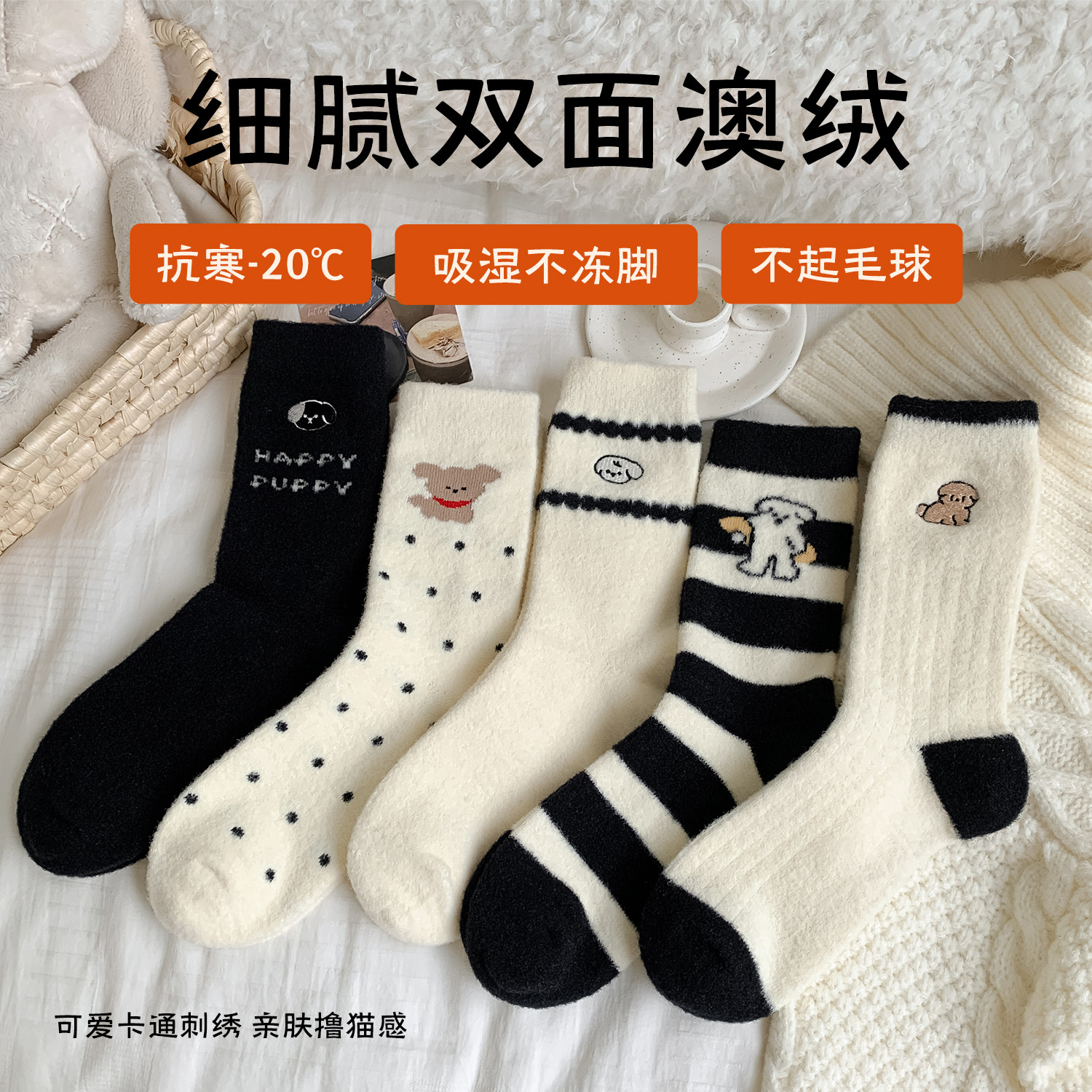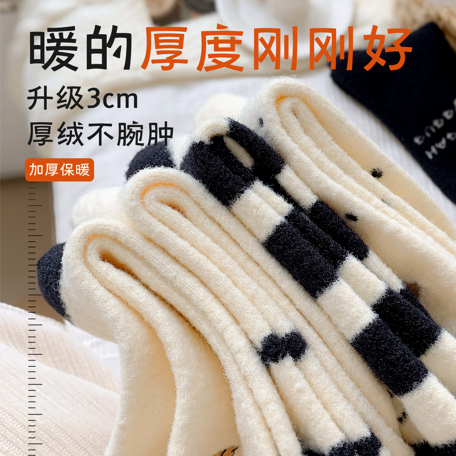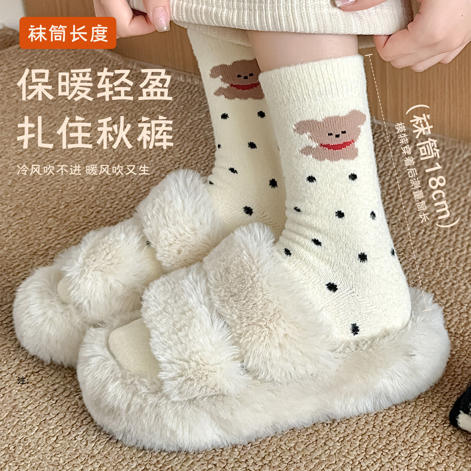 澳绒袜子女秋冬季中筒袜加绒加厚白色可爱毛绒地板睡眠袜冬天长袜