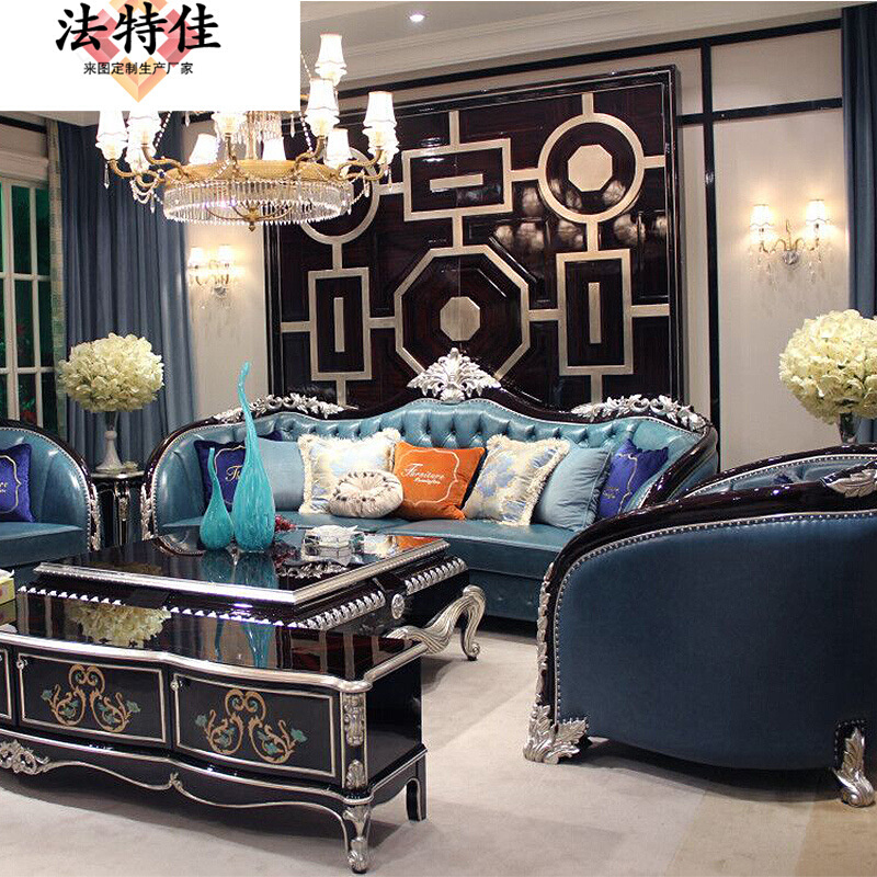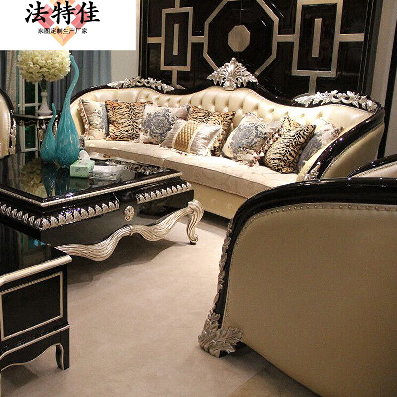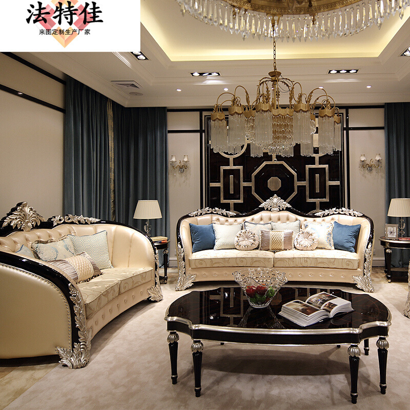 新古典客厅家具 欧式实木手工雕花大户型皮布结合四位沙发