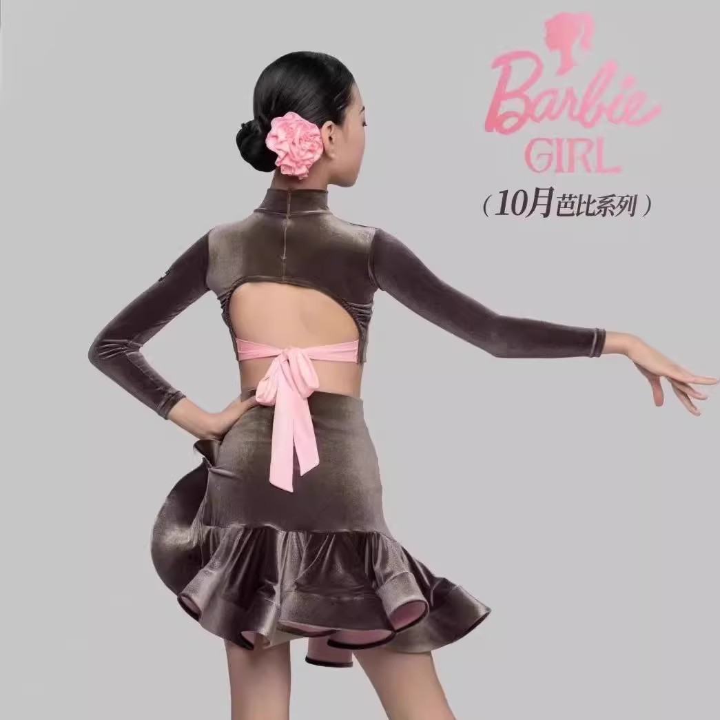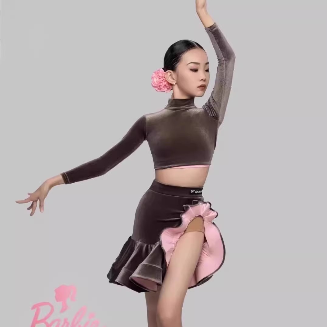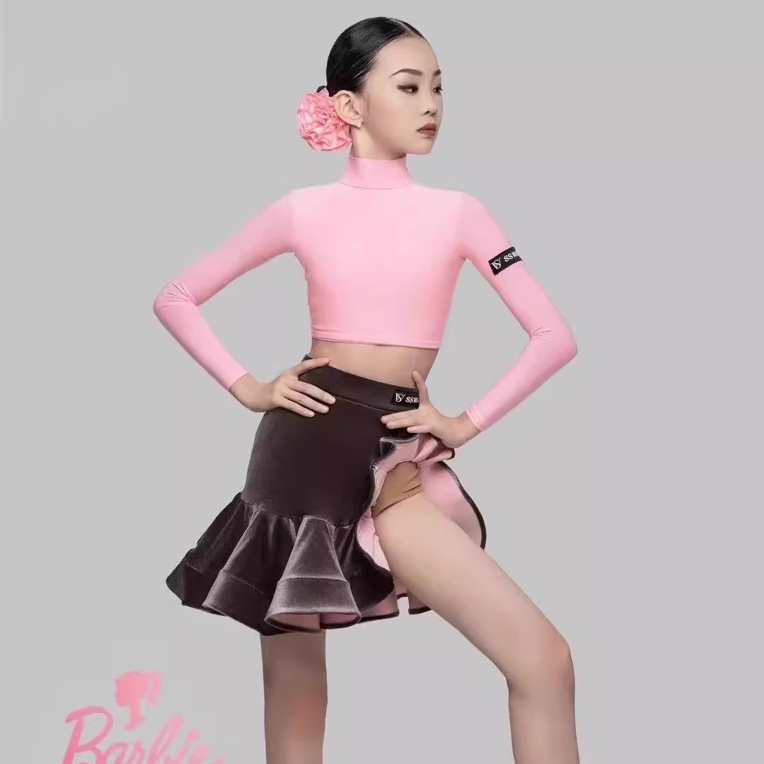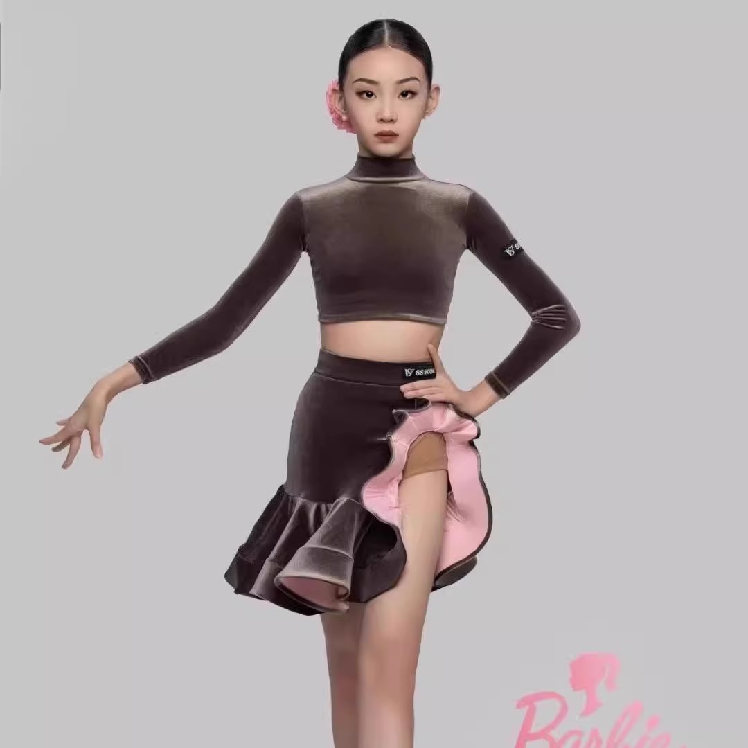 秋季新款高领长袖少儿拉丁舞服系带短款上衣丝绒半裙儿童练习服