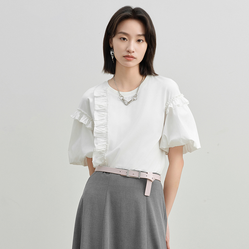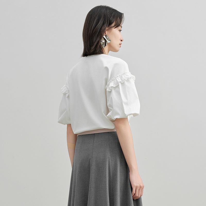艺之卉少女风白色轻奢高级感T恤2025夏季新款木耳边泡泡袖上衣