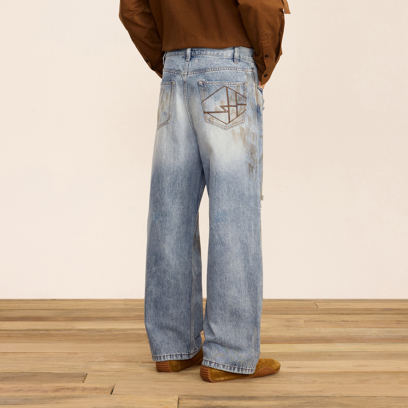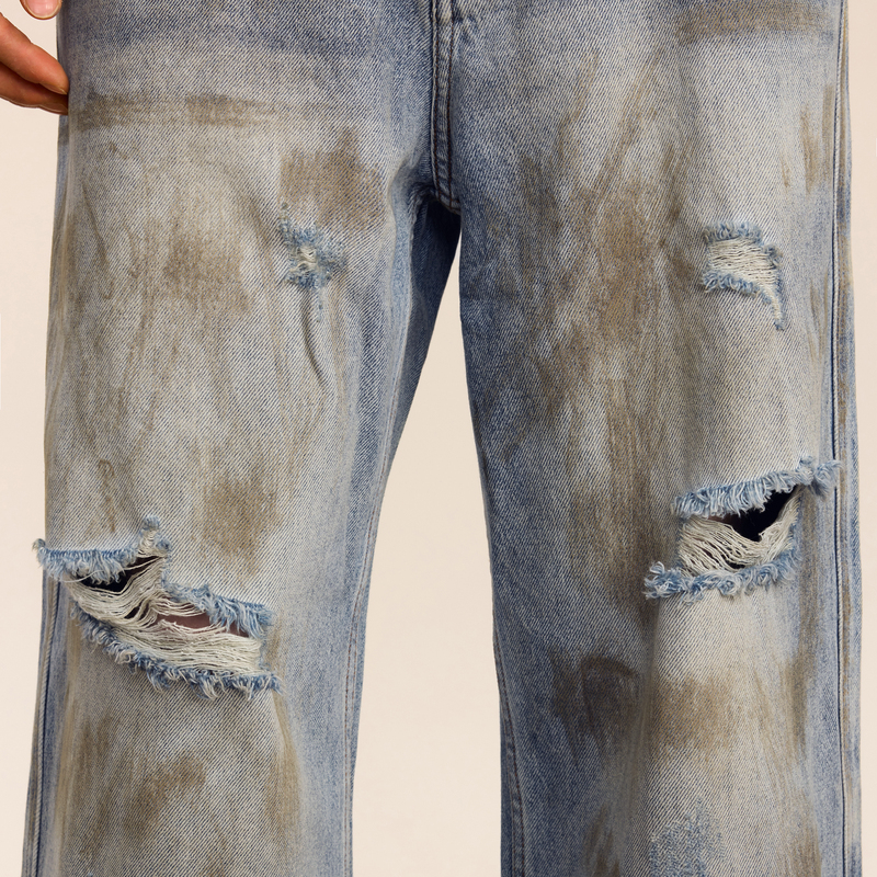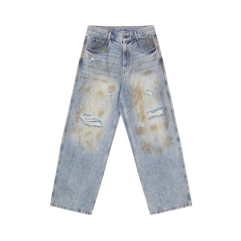 速写男装秋冬新款休闲宽松怀旧复古做旧牛仔裤直筒破洞设计潮长裤