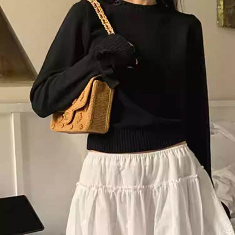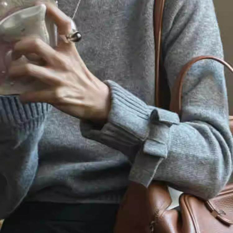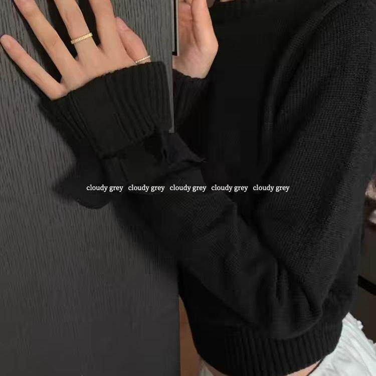 韩版温柔设计感100%纯羊毛衫女短款宽松蝴蝶结长袖毛衣套头针织衫