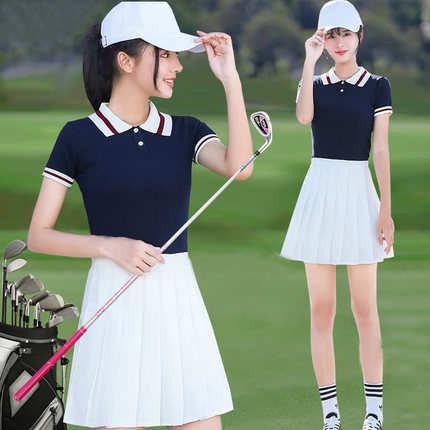 高尔夫衣服女套装夏季翻领针织短袖polo上衣防走光半身裙套装弹力