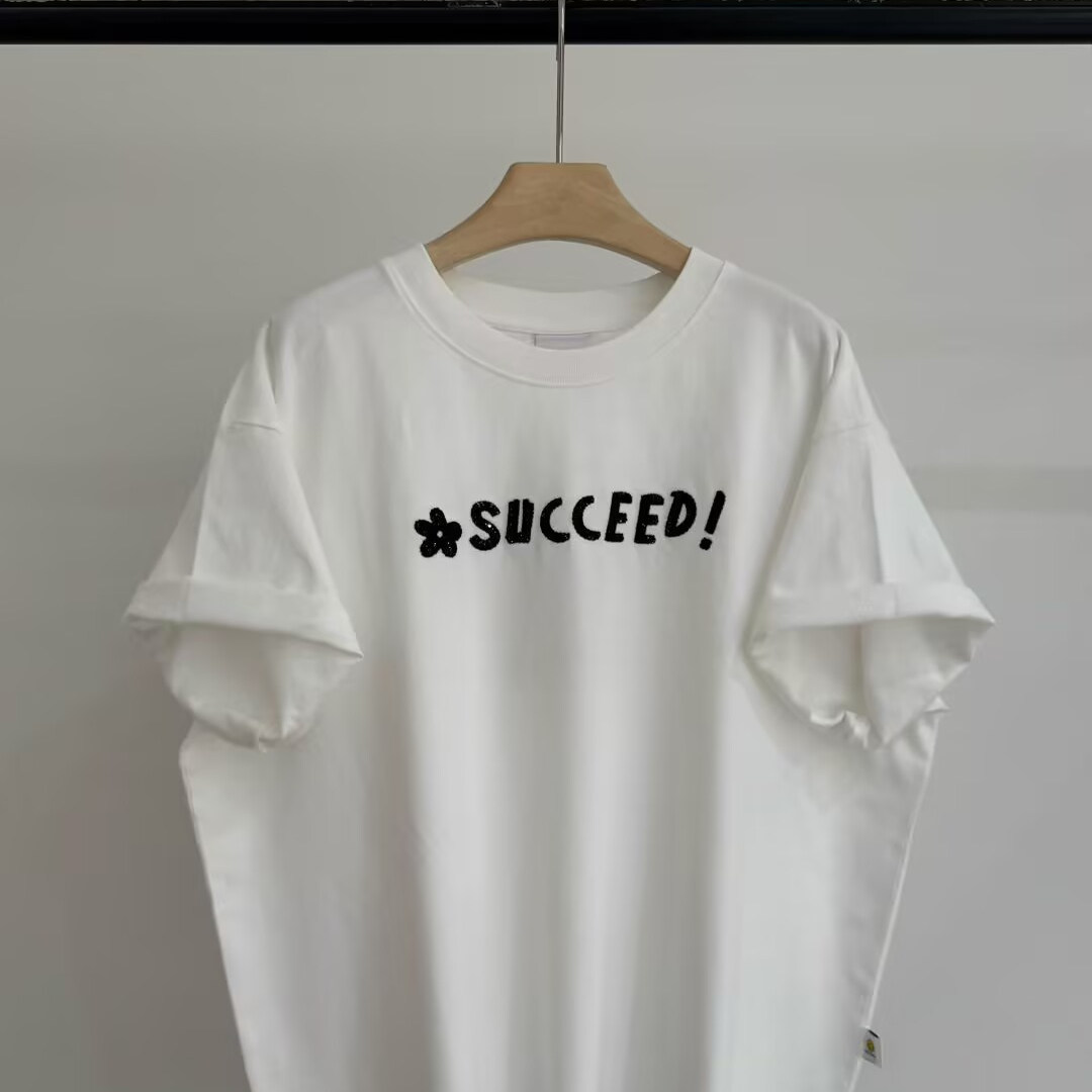皇冠2025秋季韩版刺绣英文花朵宽松显瘦休闲磨毛圆领短袖T恤女