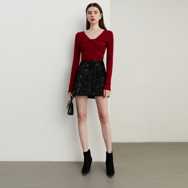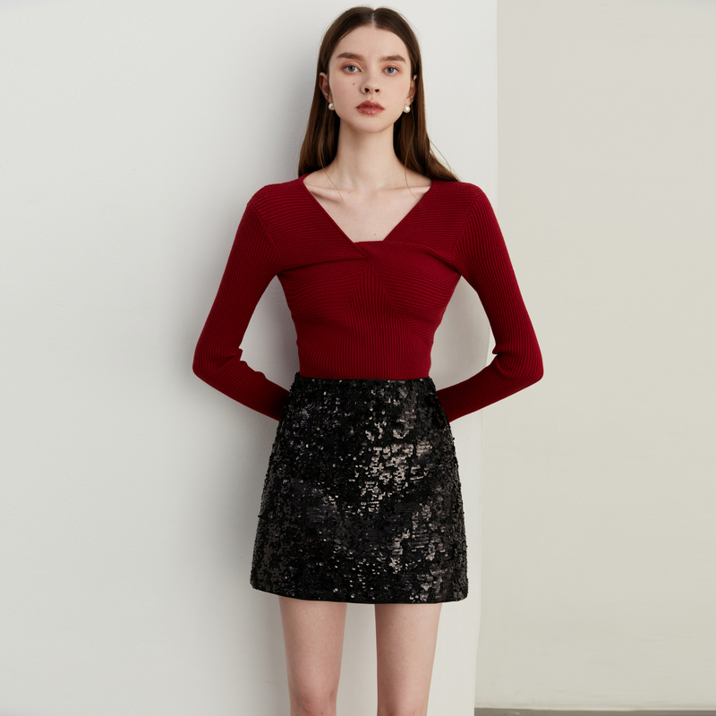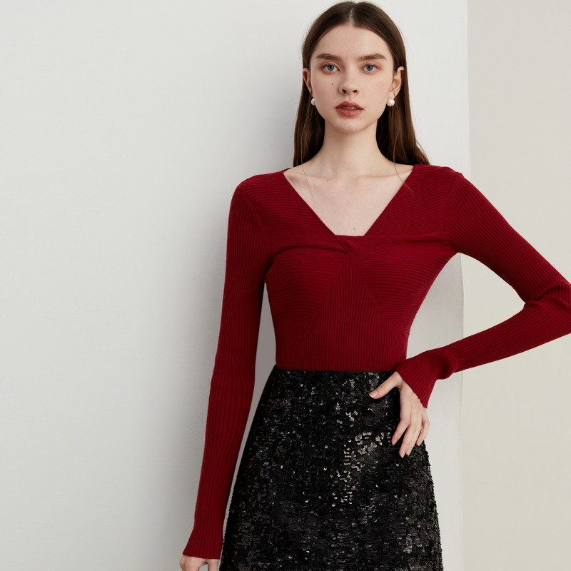 DPLAY2025秋季新款法式红色V领修身显瘦毛衣针织衫上衣长袖女