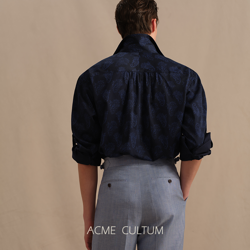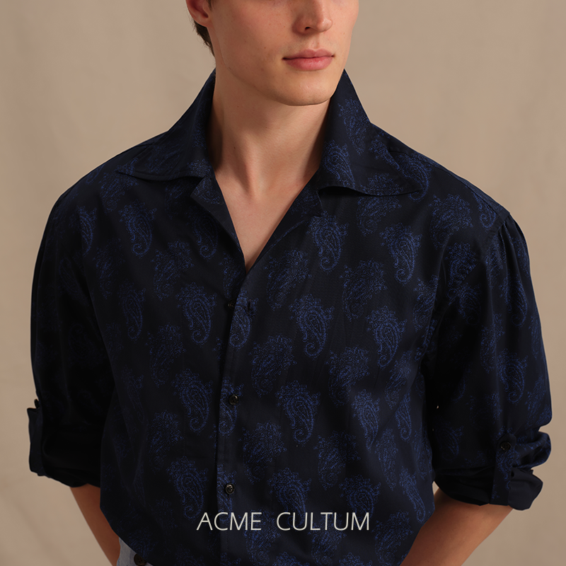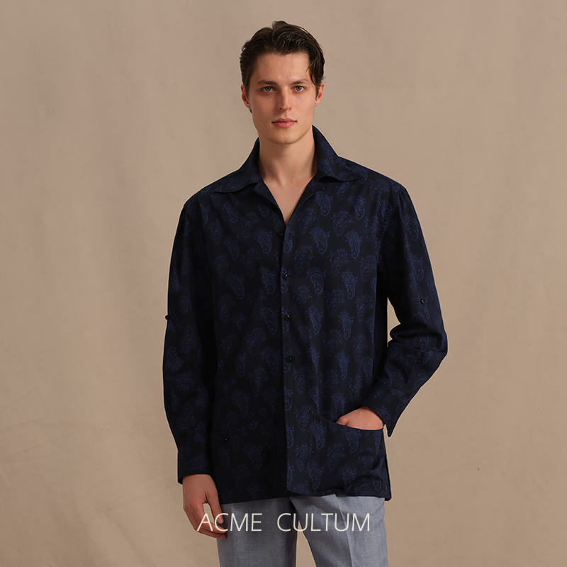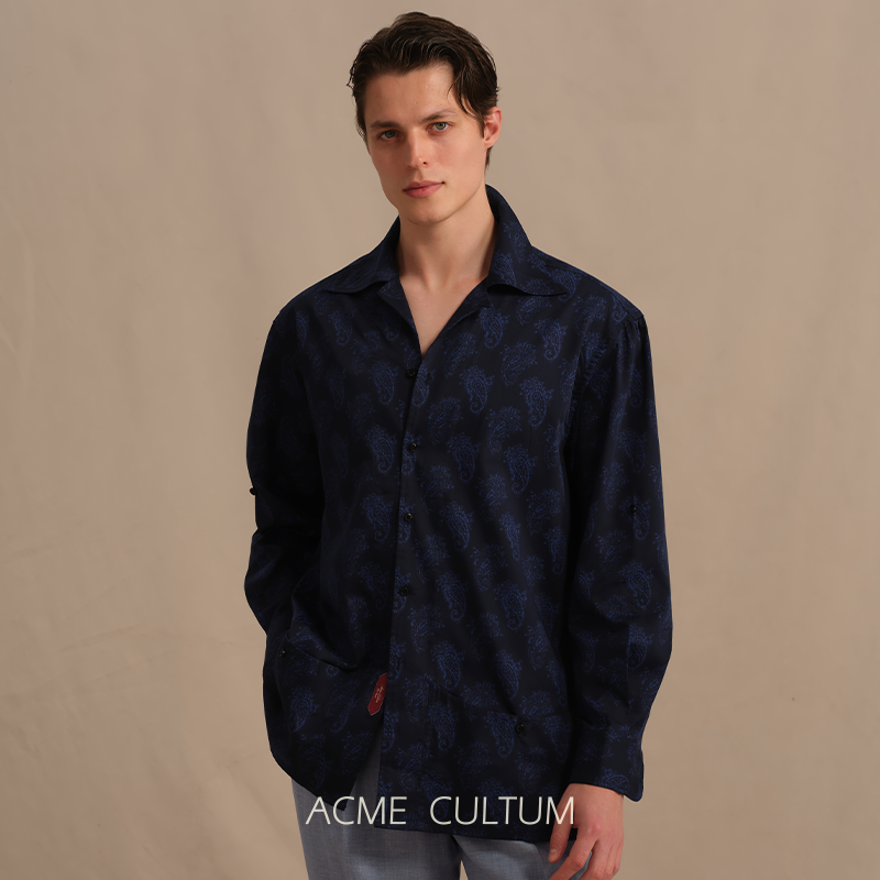 Acme cultum丝光纯棉佩斯利纹古巴领长袖衬衫男夏季宽松休闲外套
