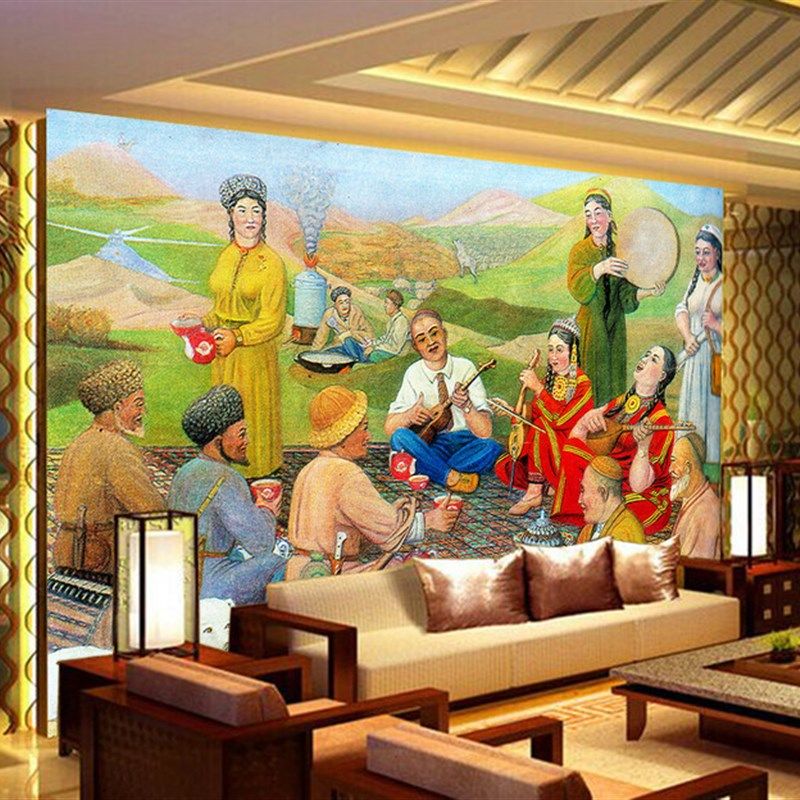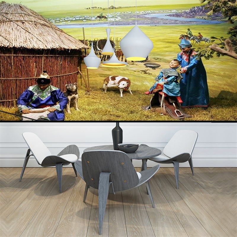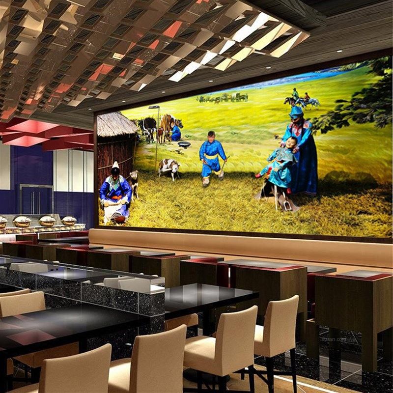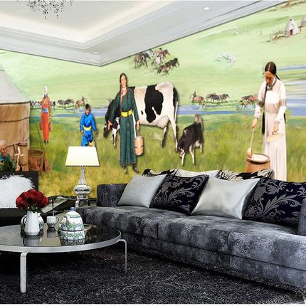 内蒙特色壁画客厅餐厅背景墙壁纸草原牧民生活场景饭店蒙古包墙纸