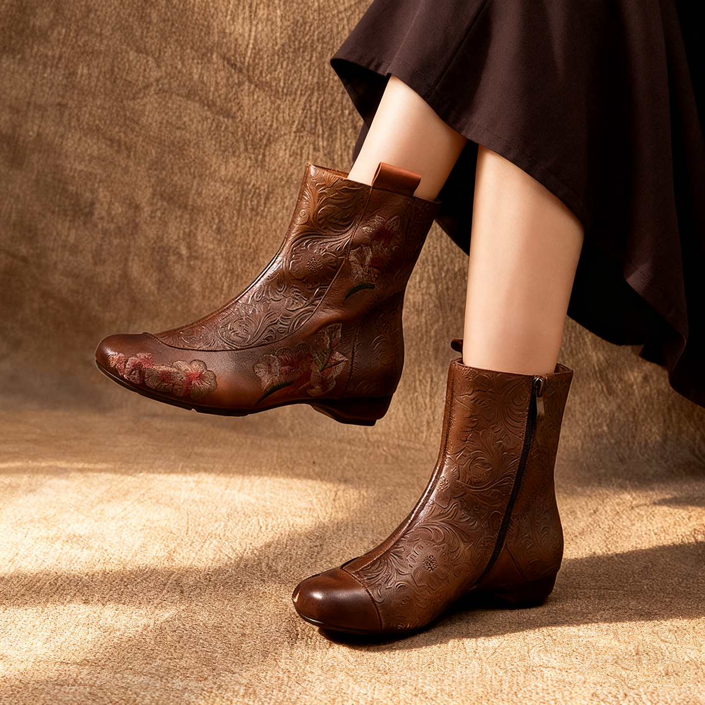 民族风真皮马丁靴秋冬新款牛筋软底侧拉链短靴手工刺绣花朵女鞋子