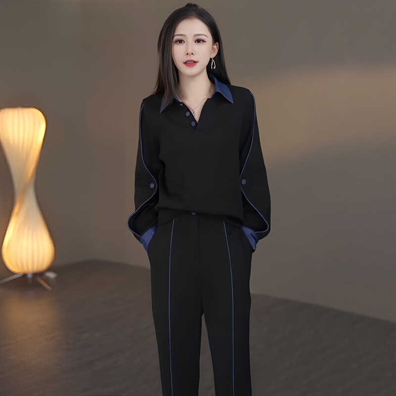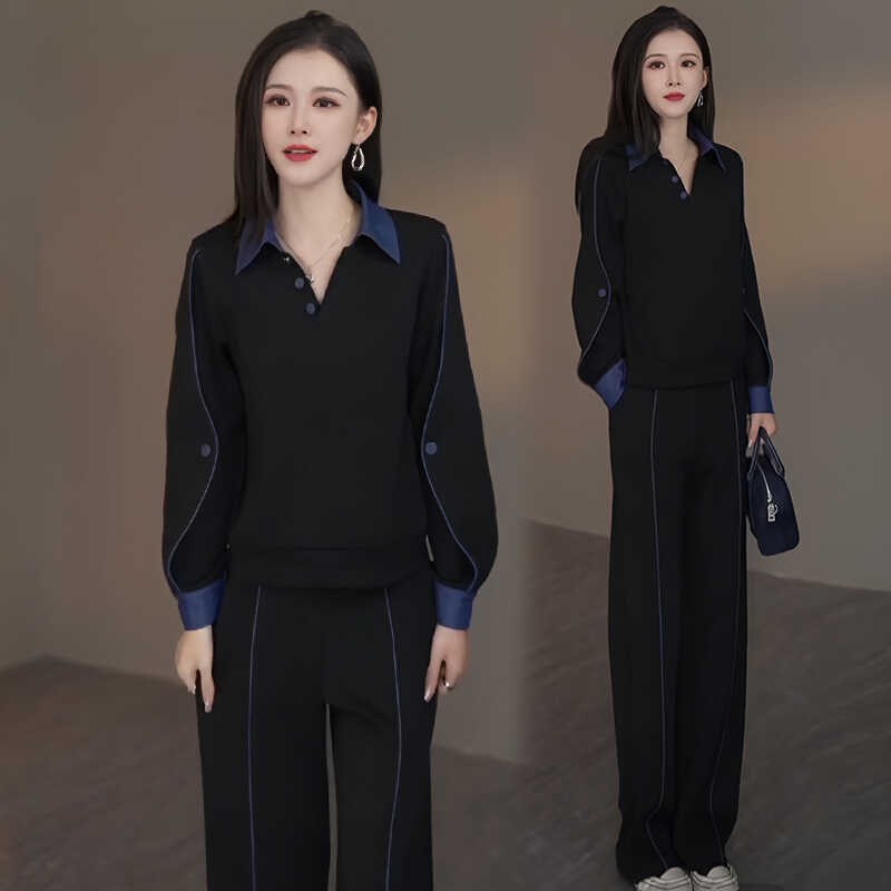 时尚套装女2024秋季新款牛仔拼接假两件长袖翻领卫衣阔腿裤两件套