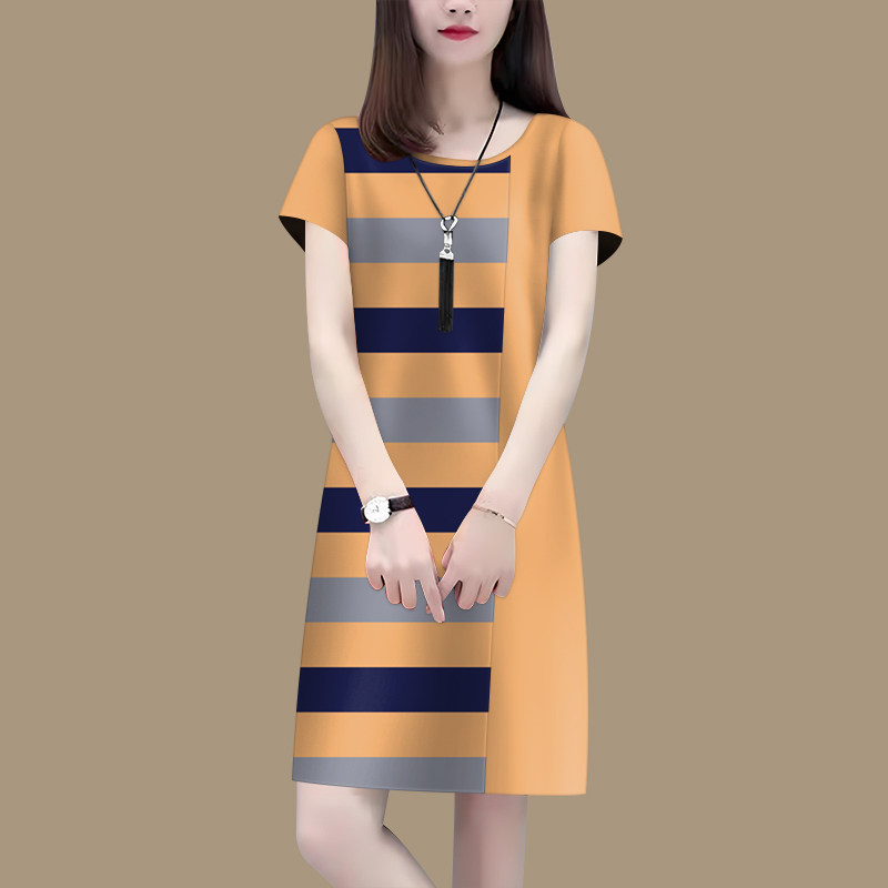 2025夏季圆领短袖连衣裙印花韩版条纹时尚百搭宽松显瘦拼接中长裙