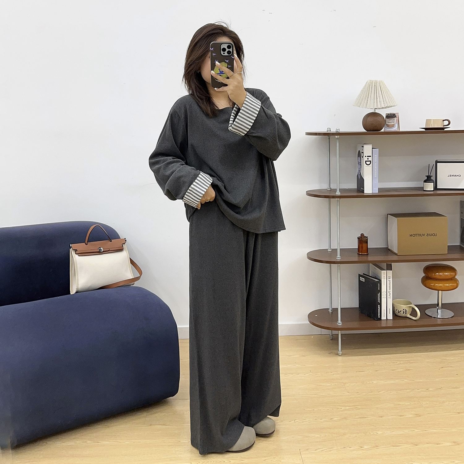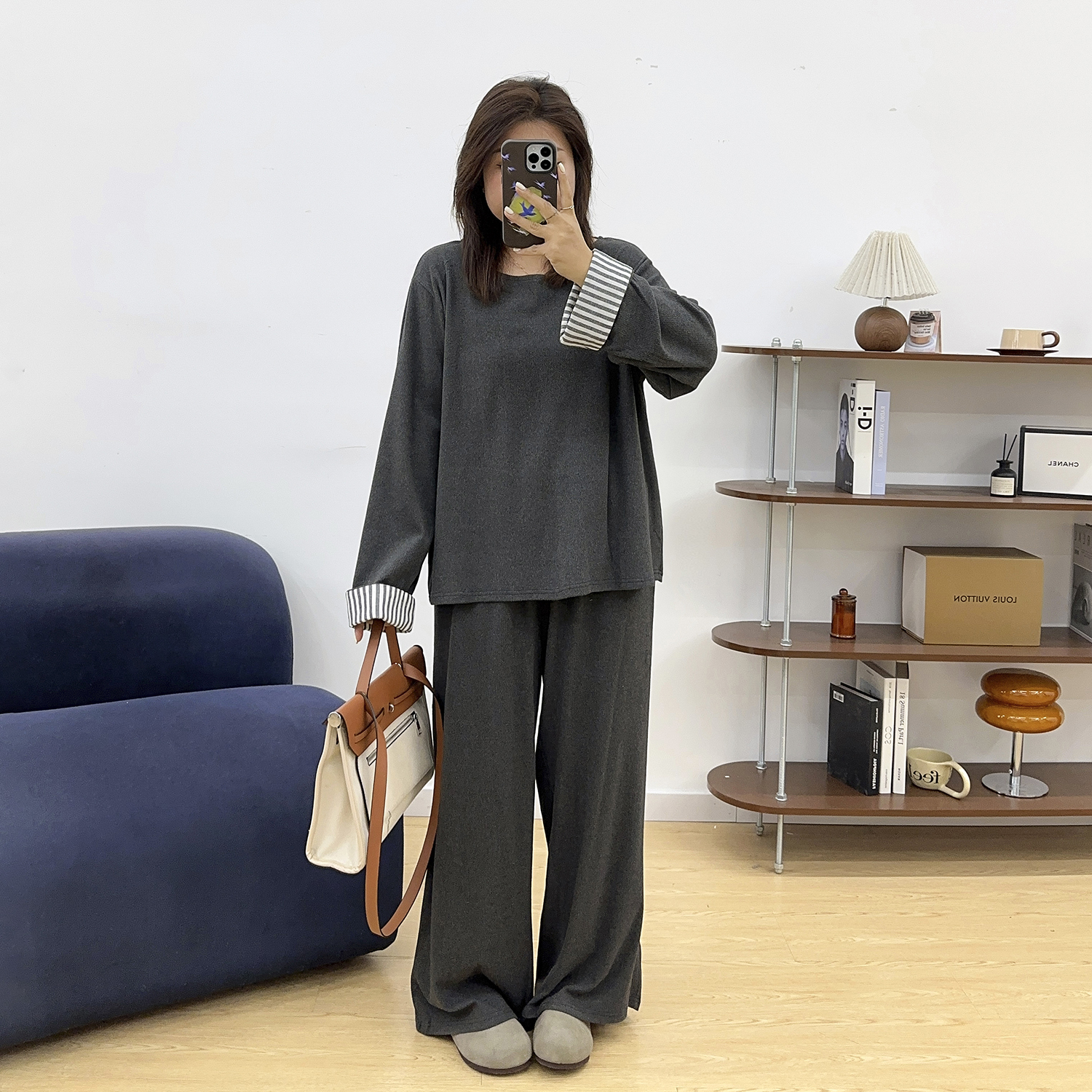 宛宛大码秋季新款胖mm拼接长袖休闲宽松显瘦慵懒风阔腿长裤两件套