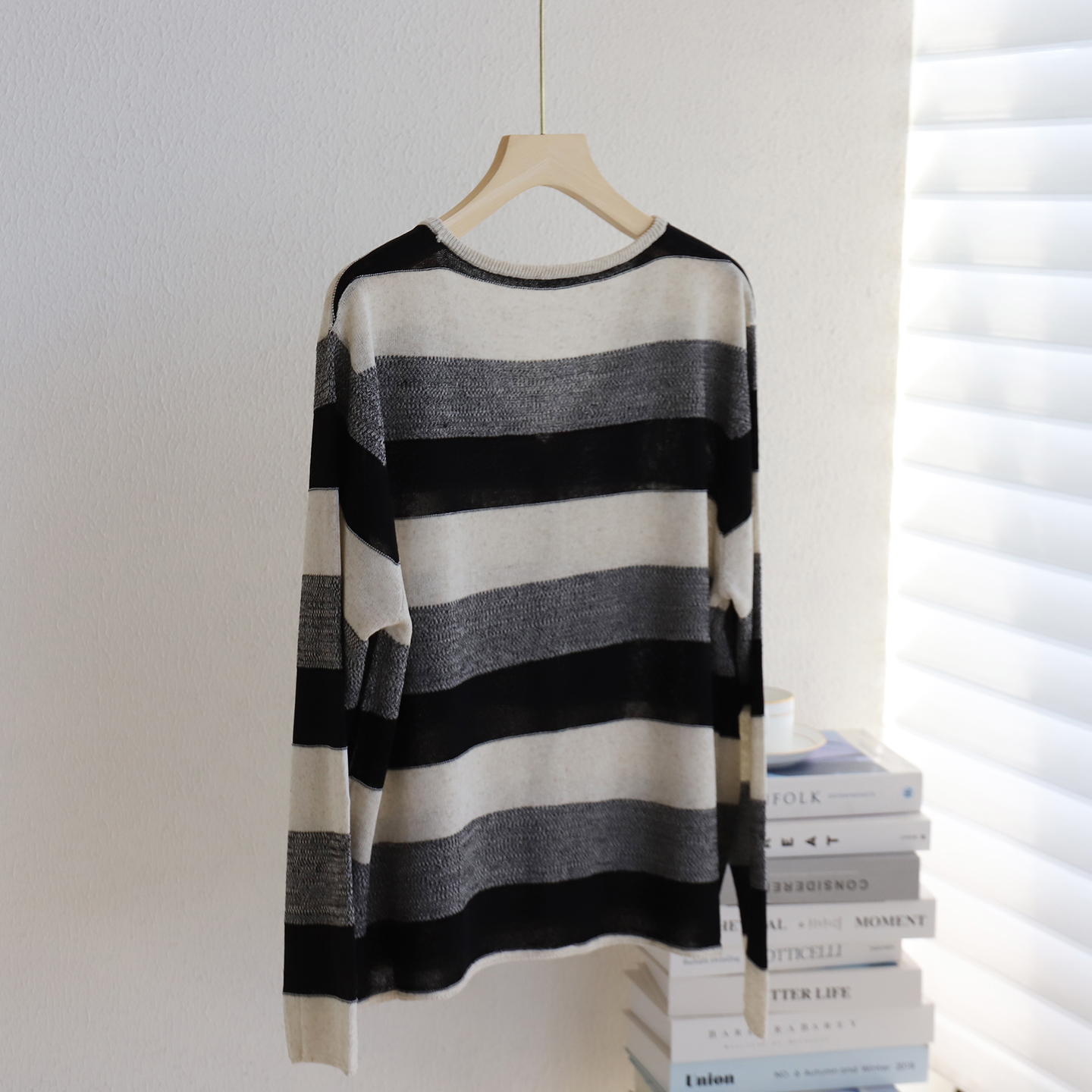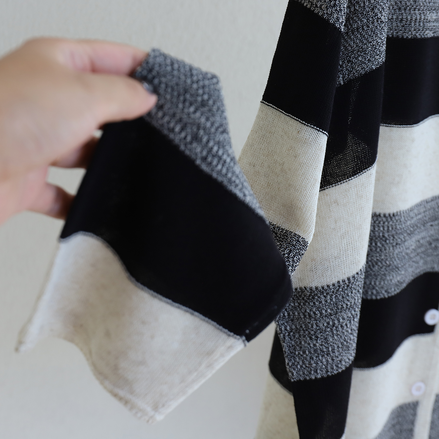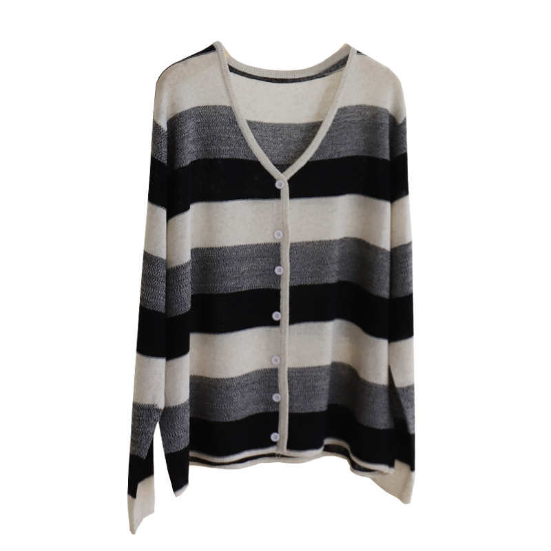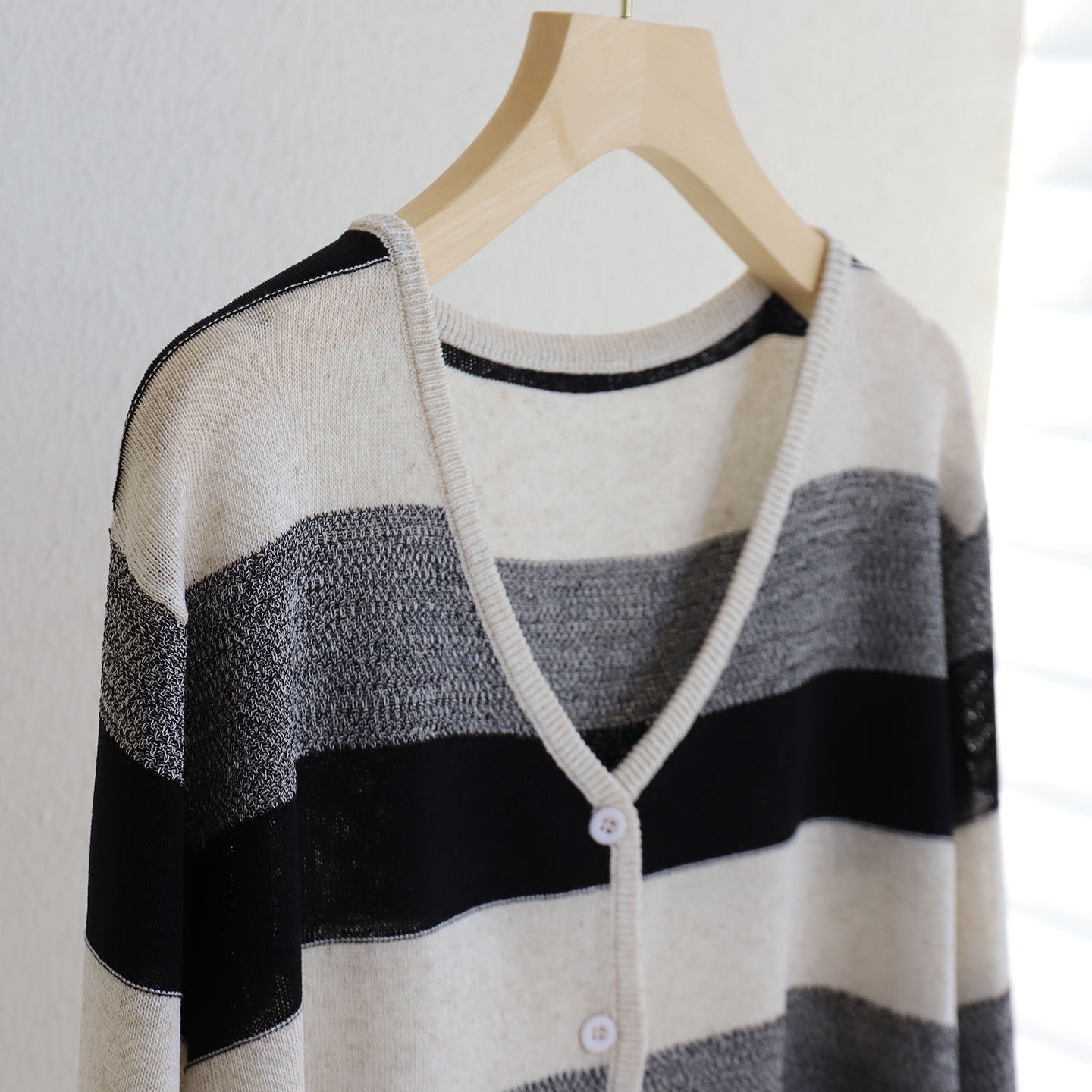 2025秋季新款针织衫女开衫宽松V领天丝亚麻条纹外搭长袖外套上衣