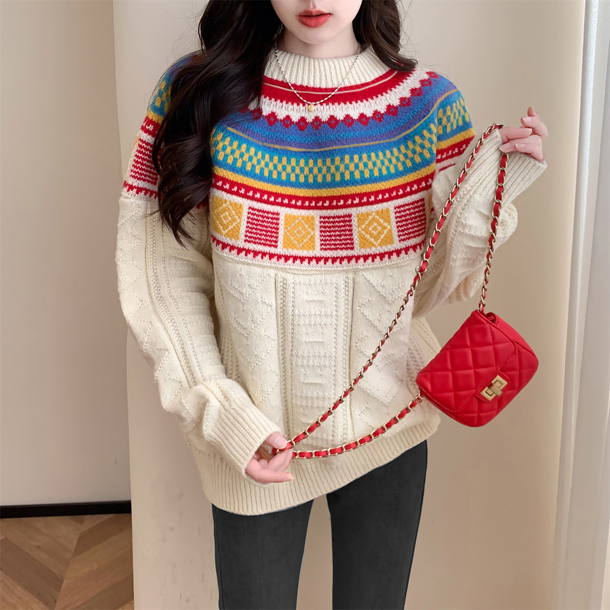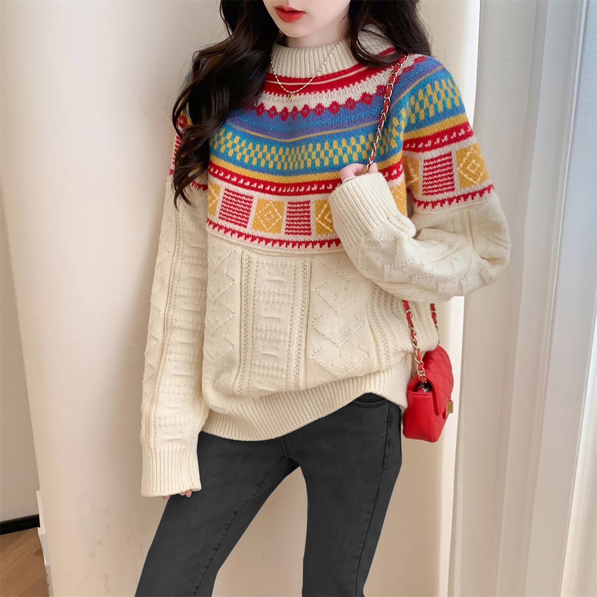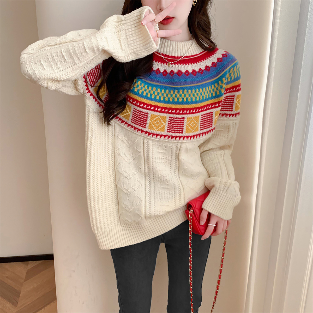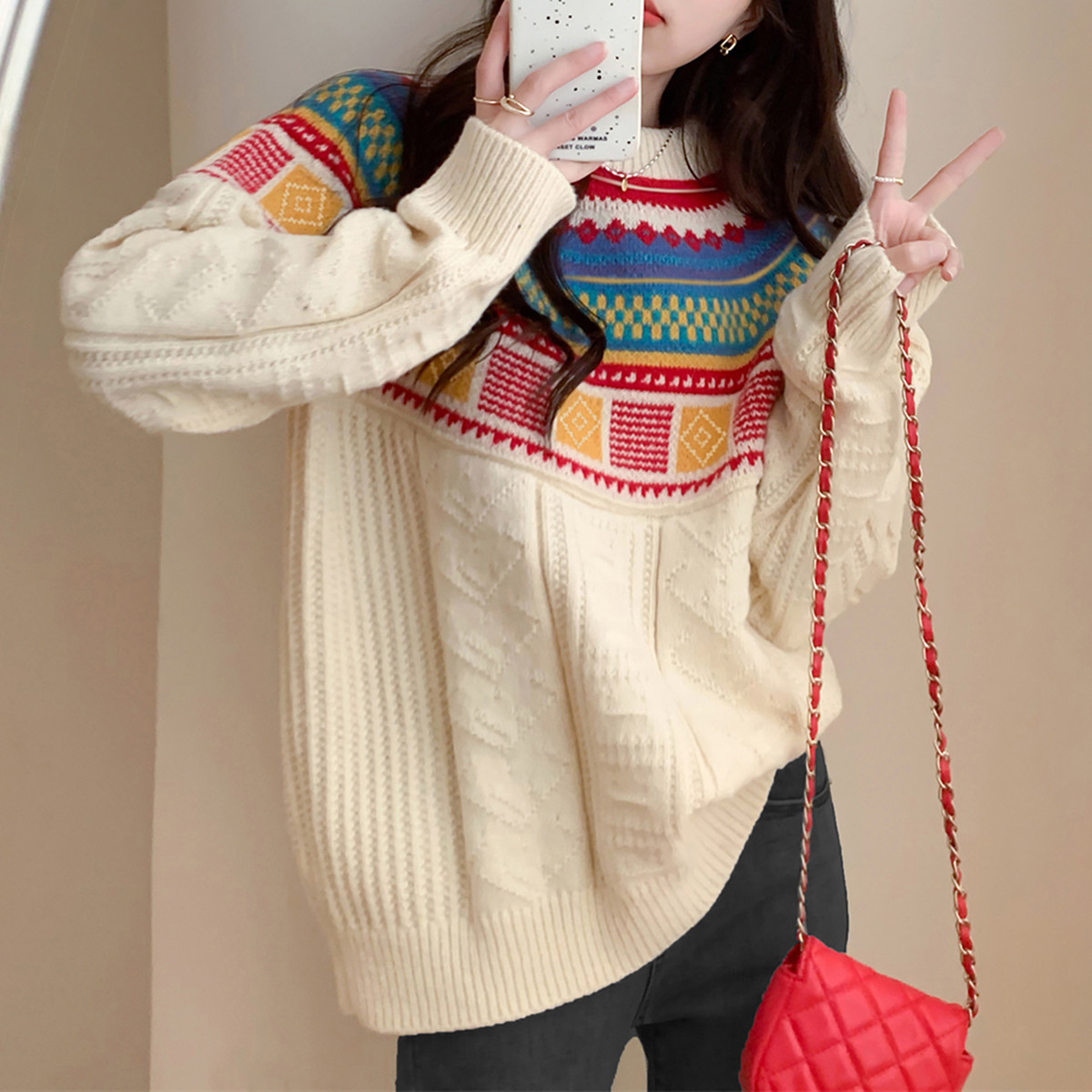 唐狮秋冬新款女毛衣小众减龄洋气彩色几何图案圆领套头上衣女TM