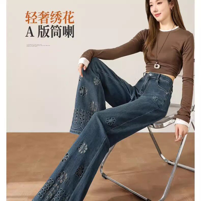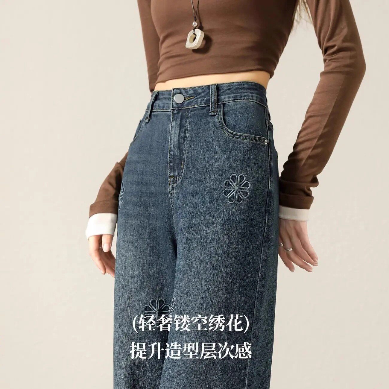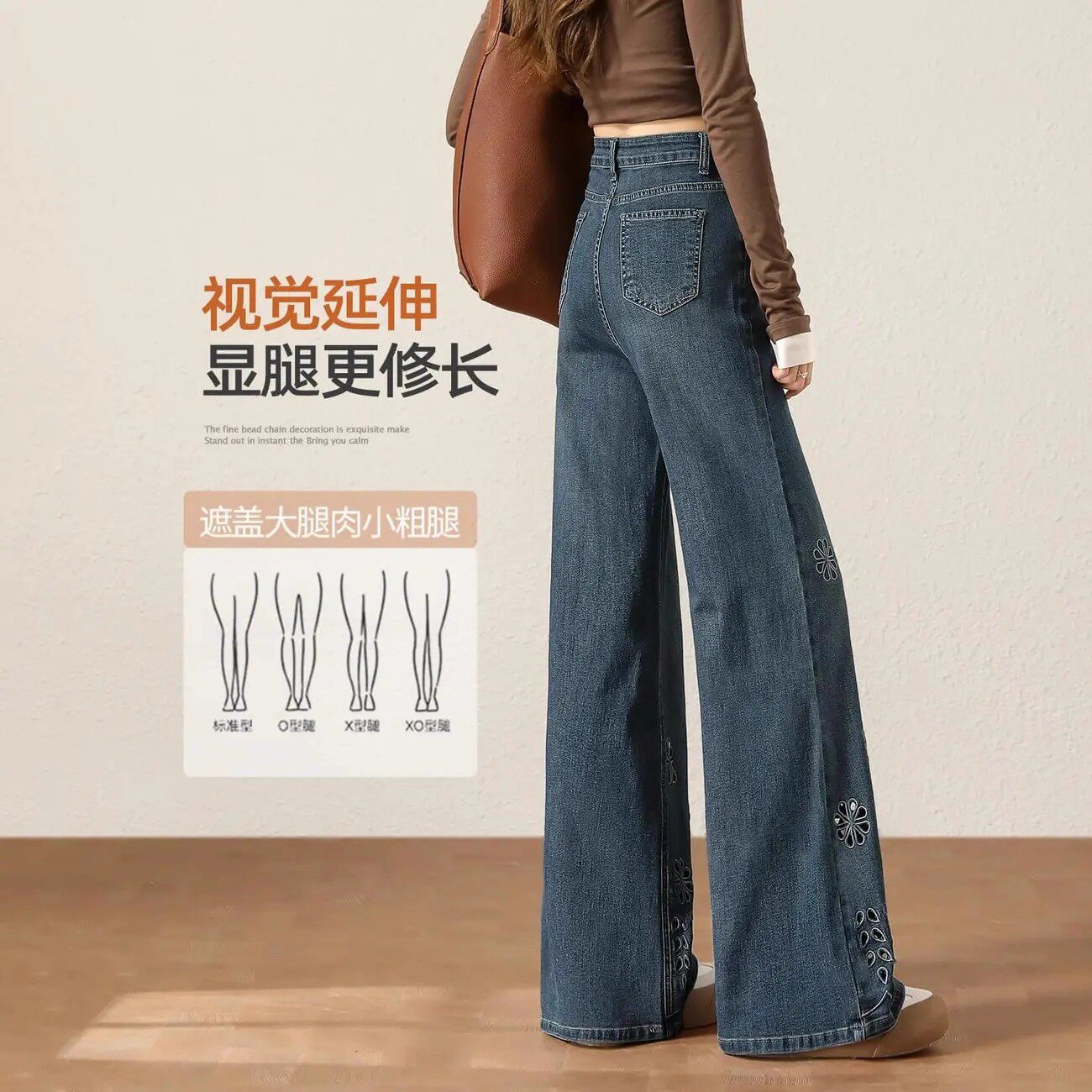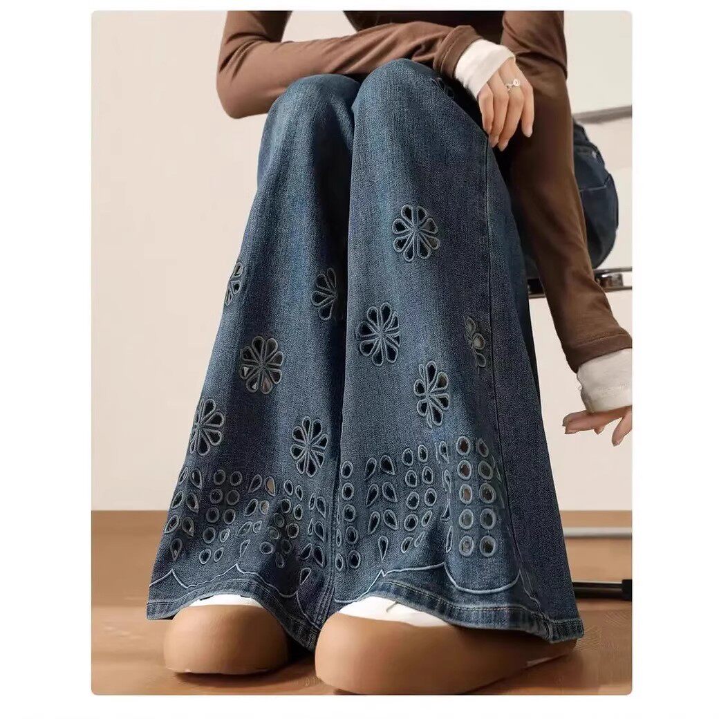 阔腿牛仔裤女秋季2025新款高腰垂感宽松设计感镂空直筒拖地喇叭裤