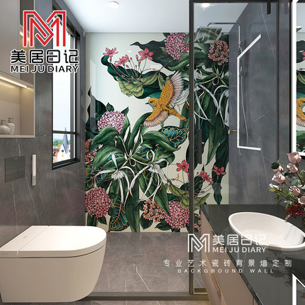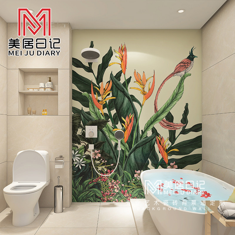 新中式卫生间浴室个性艺术植物花鸟背景墙瓷砖柔光砖大板壁画定制