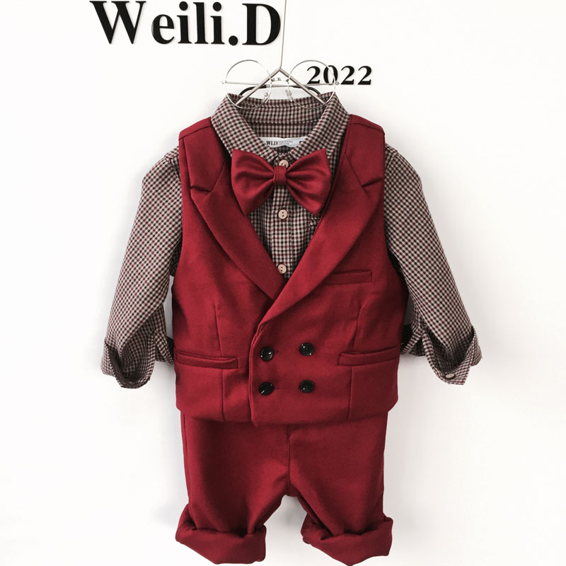 男宝宝周岁抓周红色礼服春季新款男童绅士花童小西装马甲长袖套装