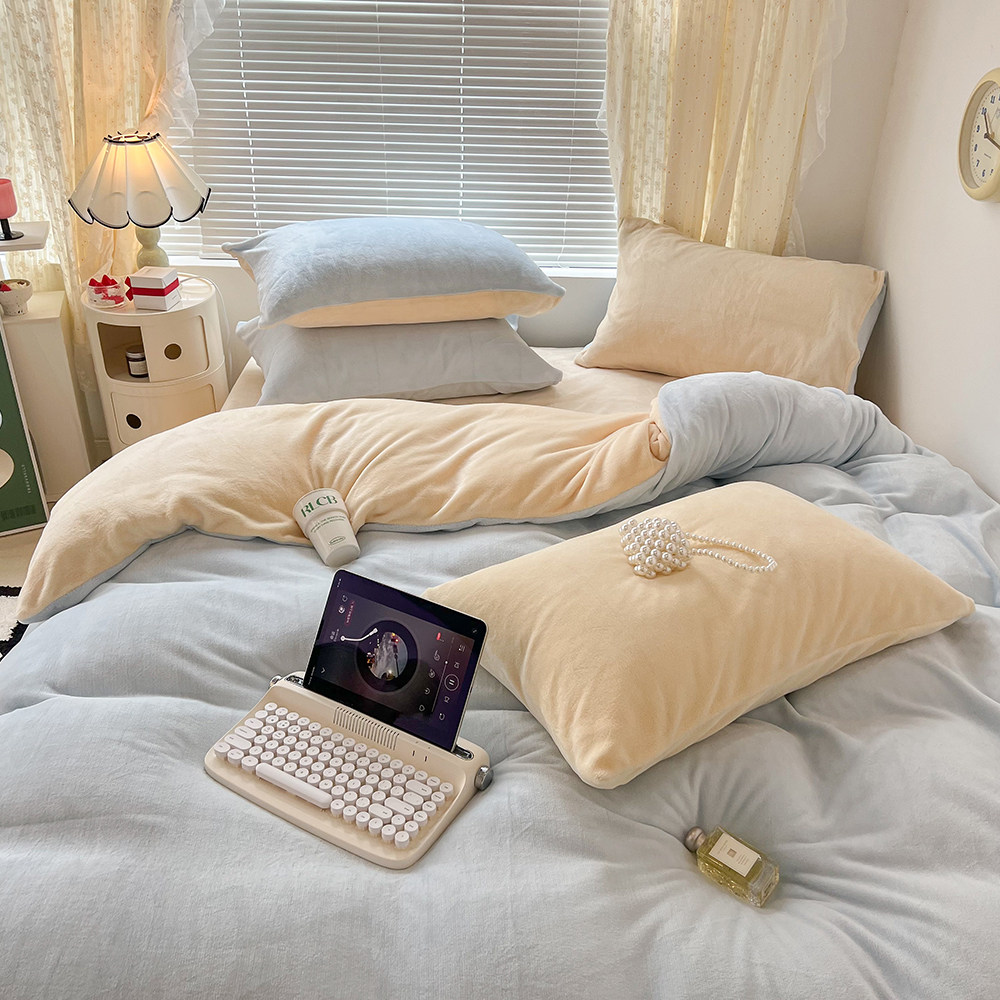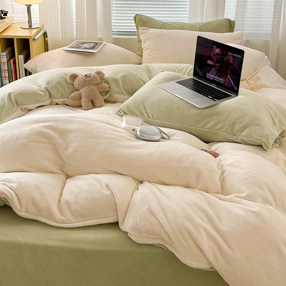 冬季纯色双拼牛奶绒四件套双面
