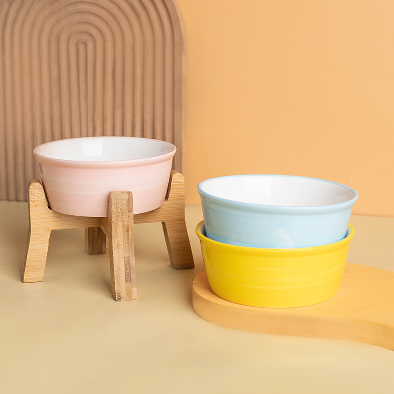 宠物猫粮碗宽口高脚木架陶瓷碗防打翻饮水碗小型幼犬比熊宠物用品