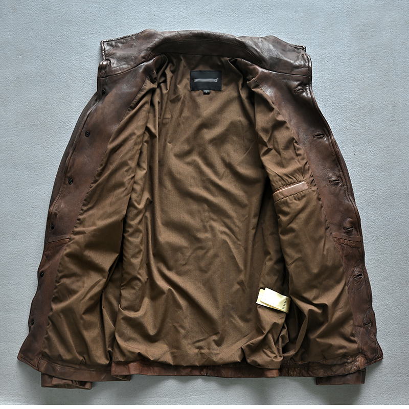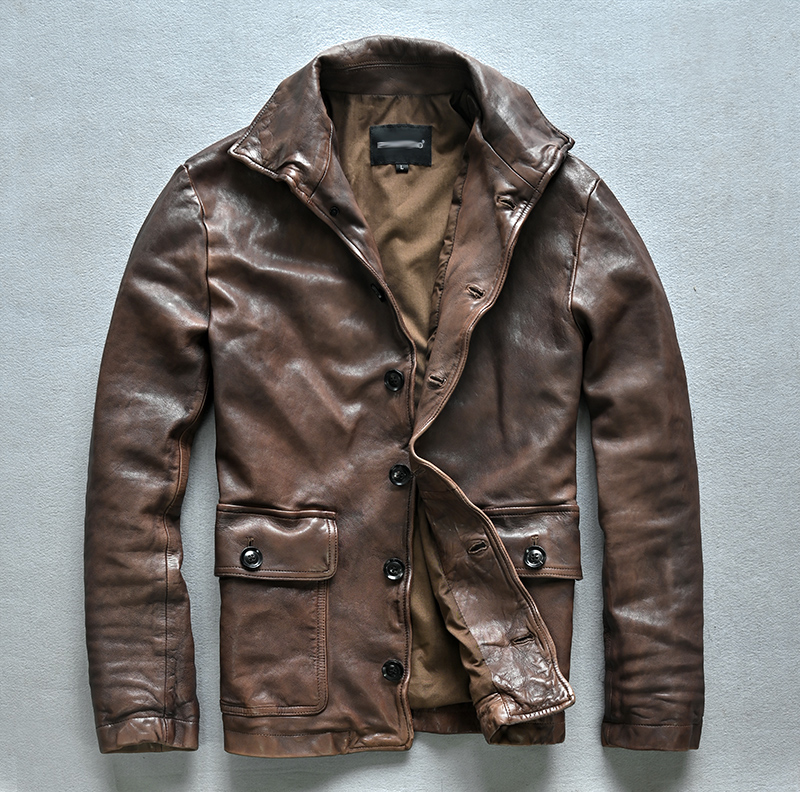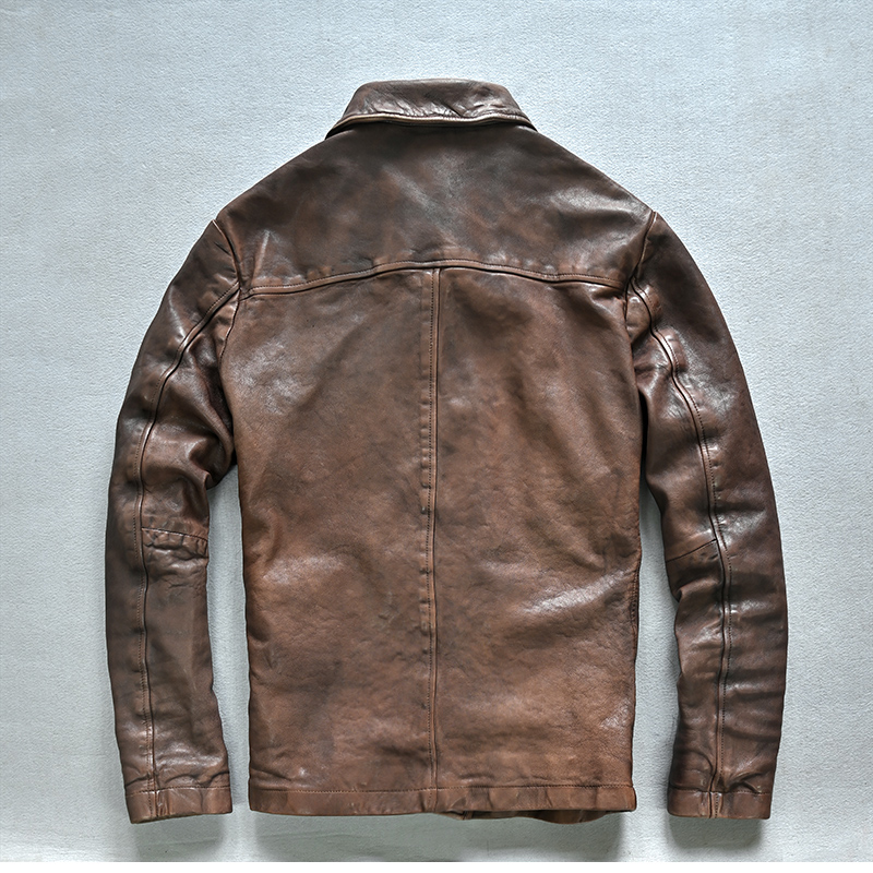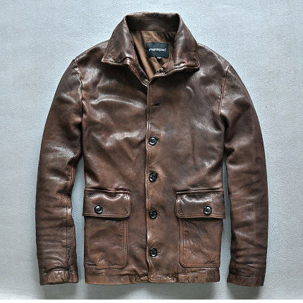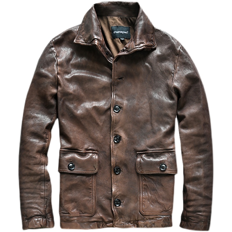 日系复古男士修身翻领常规款水洗旧化单排扣植鞣绵羊皮真皮皮衣