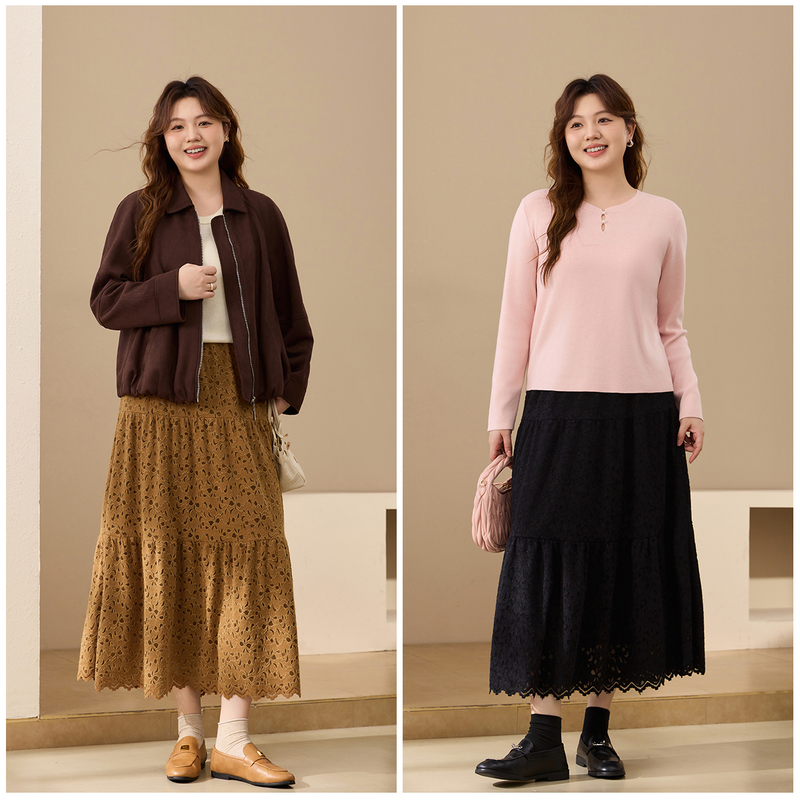 【剪花肌理蕾丝裙】纤莉秀大码女装复古文艺风半身裙胖mm冬装新款