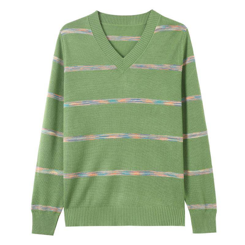 妈妈装V领长袖针织羊毛衫女条纹上衣时尚秋冬宽松大码打底针织衫