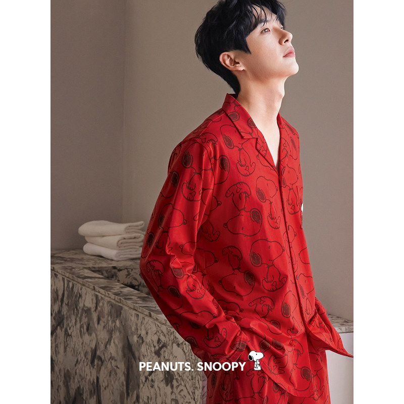 贝妍春秋新婚情侣睡衣柔软棉长袖史努比套装男女红色本命年家居服