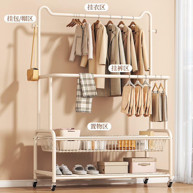 衣帽架落地卧室家用简易移动双杆晾衣架衣服收纳置物架挂衣服架子