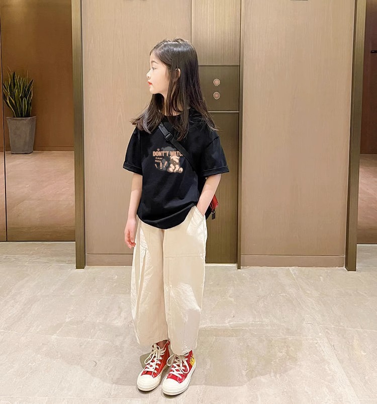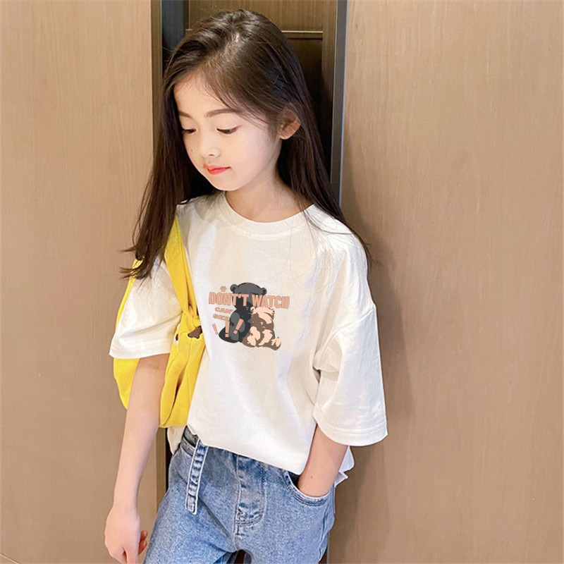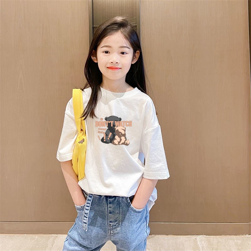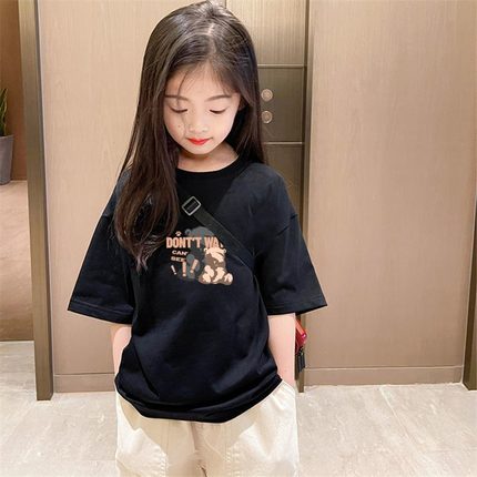 女童纯棉薄款短袖T恤夏季新款2025中大童洋气女孩小熊印花上衣潮